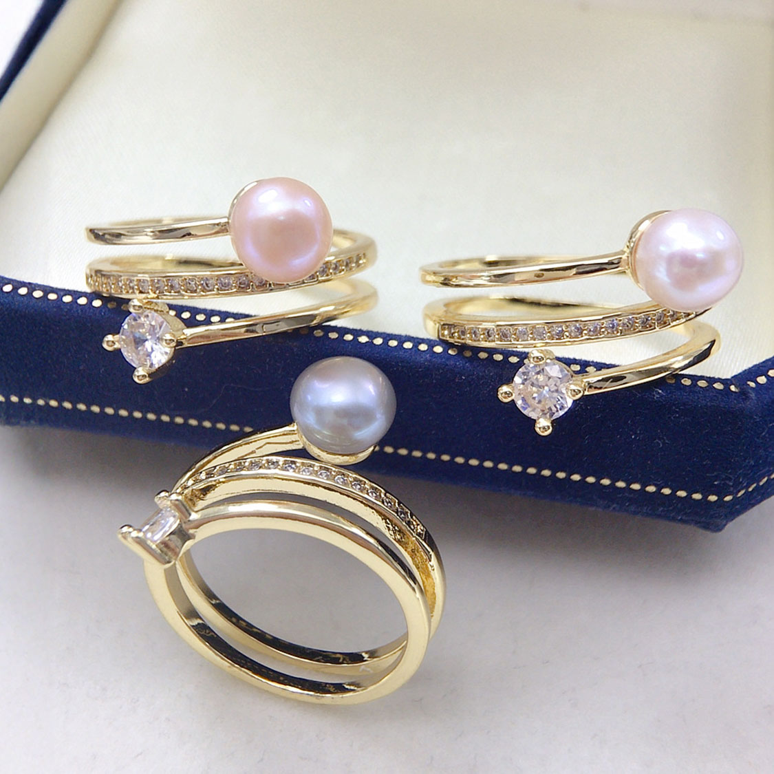 想同時擁有珍珠的溫潤與鑽石般的閃耀?這款三圈淡水珍珠鋯石纏繞開口戒指,把兩種光芒優雅疊加在一起。金色戒圈以纏繞感設計環抱指尖,一圈素面、一圈排鑲細鋯石,再延伸出一顆明亮鋯石,層次豐富卻不顯厚重;上方一顆約7-8mm天然淡水扁圓珍珠靜靜坐落其間,光澤細膩圓潤,抬手間就像自帶柔焦濾鏡。