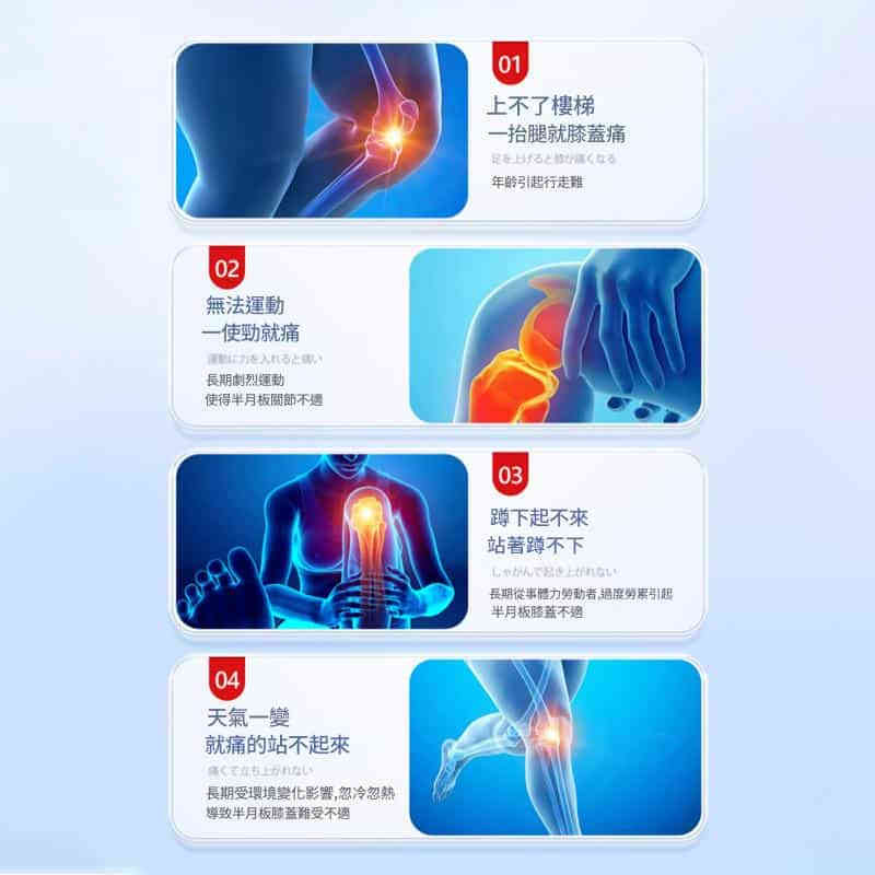 能迅速緩解因勞損、退化或風寒引起的膝蓋劇痛與痠軟無力,並有助於促進積水吸收,減輕關節腫脹感。修護軟骨,改善活動