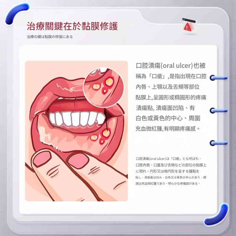 精選溫和修復成分,不易對敏感的口腔黏膜造成過度刺激,旨在溫和護理不適。 -