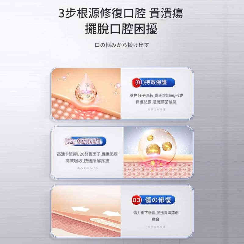 成分能於創口表面形成一層透氣保護層,有效隔絕食物刺激,減輕疼痛,並為組織修復創造良好環境,加速癒合進程。 -