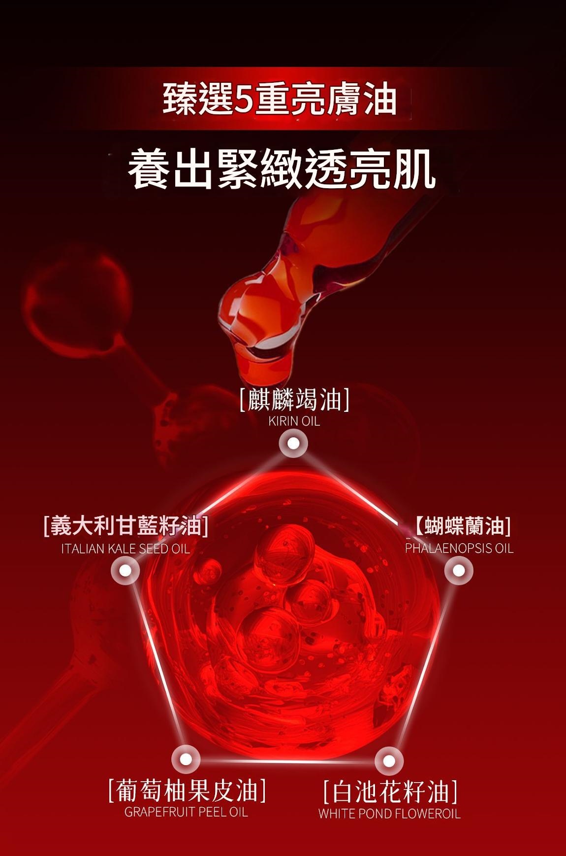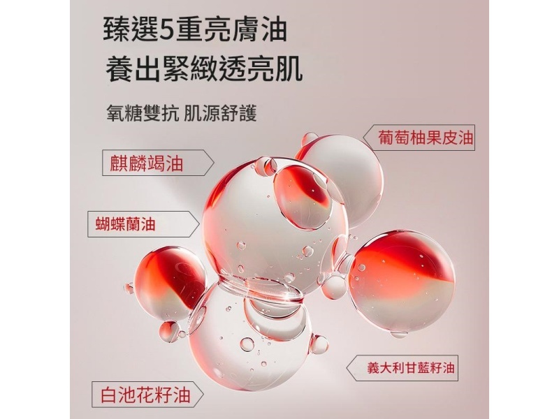 獨家「5:5黃金水油比」配方,水油分層設計,一觸化水、輕盈好吸收,是油非油的清爽膚感,養出透亮緊緻肌。
