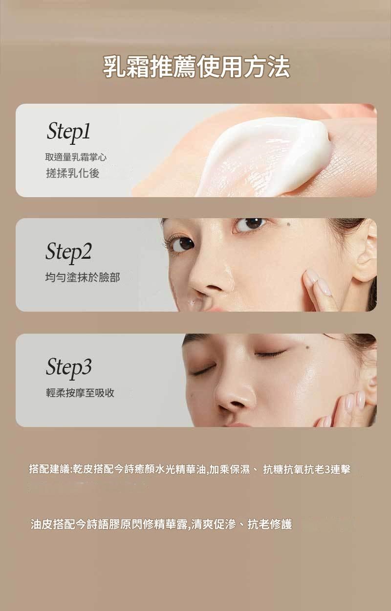 無論是初老細紋、鬆弛下垂,或是深層凹陷、膚質粗糙,今詩語超越版乳霜以科學複配與實證功效,助你重現緊緻、飽滿、光澤的東方皮相美。