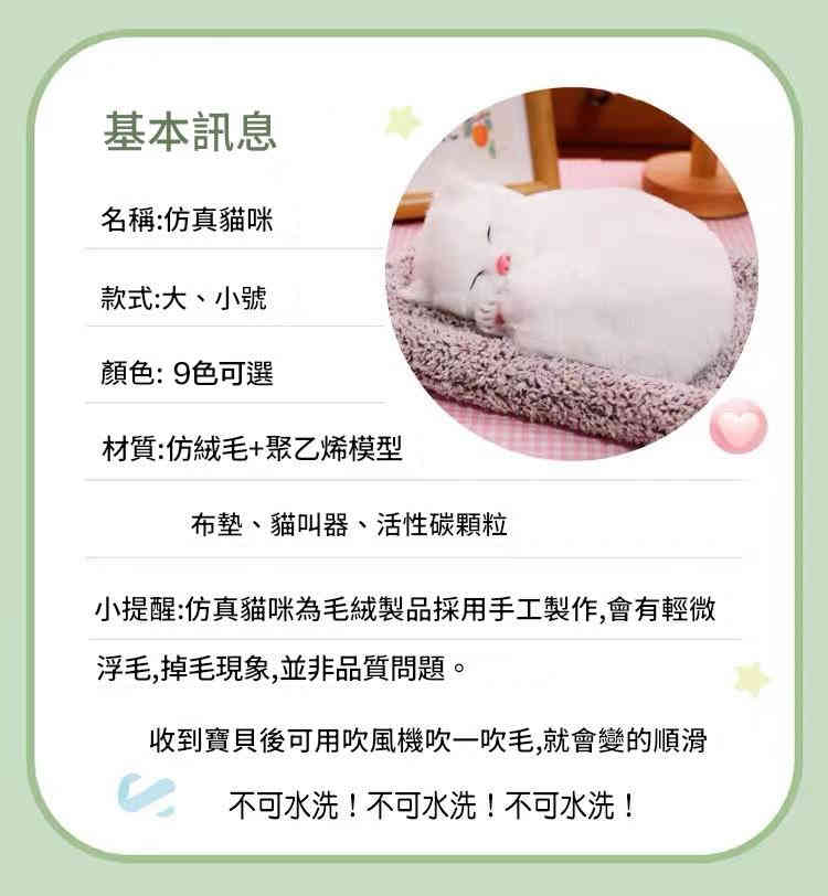 9種仿真貓咪造型玩偶,每隻貓咪皆可愛逼真且會喵叫,附絨布墊,適合送禮及自用;提供小號(19x14cm)及大號(21x19cm)尺寸選擇,尺寸更大更療癒。嚴選高質仿絨毛材質,手工製作,每隻貓咪獨具特色。內設貓叫器及活性炭顆粒,吸附異味兼具趣味互動。9款式包含:橘貓、波斯貓、青道貓、經典黃塊貓、黑耳朵貓、黃耳朵貓、拼接黃虎紋、拼接灰虎紋、黑貓。每款都帶來家庭溫馨和療癒氛圍,適合居家、辦公室、汽車等多種場景。