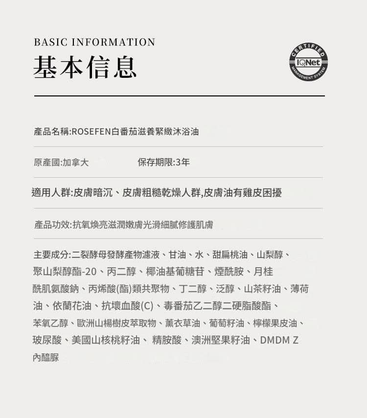 加拿大進口 Rosefen 白番茄滋潤緊緻沐浴油(400ml)