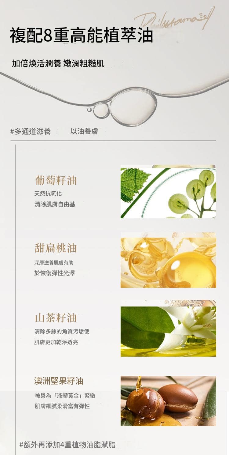 復配葡萄籽油、甜扁桃油、山茶籽油等,深層滋養修護