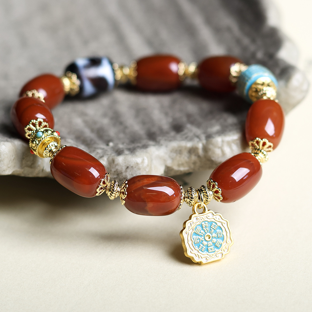 · 天然南紅,國風雅韻: 選用天然南紅瑪瑙打磨而成的桶形珠串,南紅色澤紅潤濃郁,自古被視為吉祥、富貴的象徵,契合新中式美學與國風文化潮流,彰顯低調雅緻的品味。