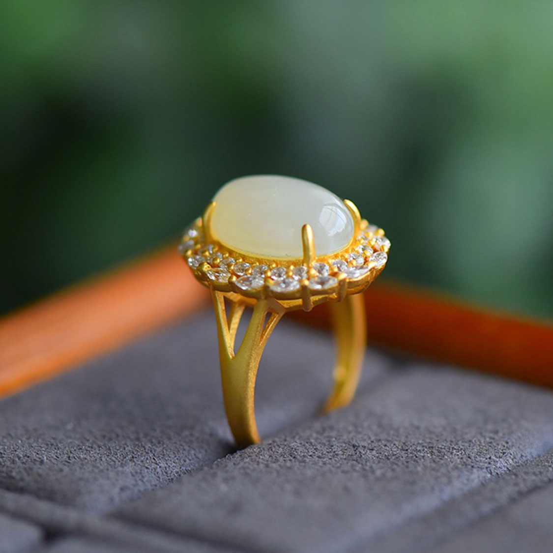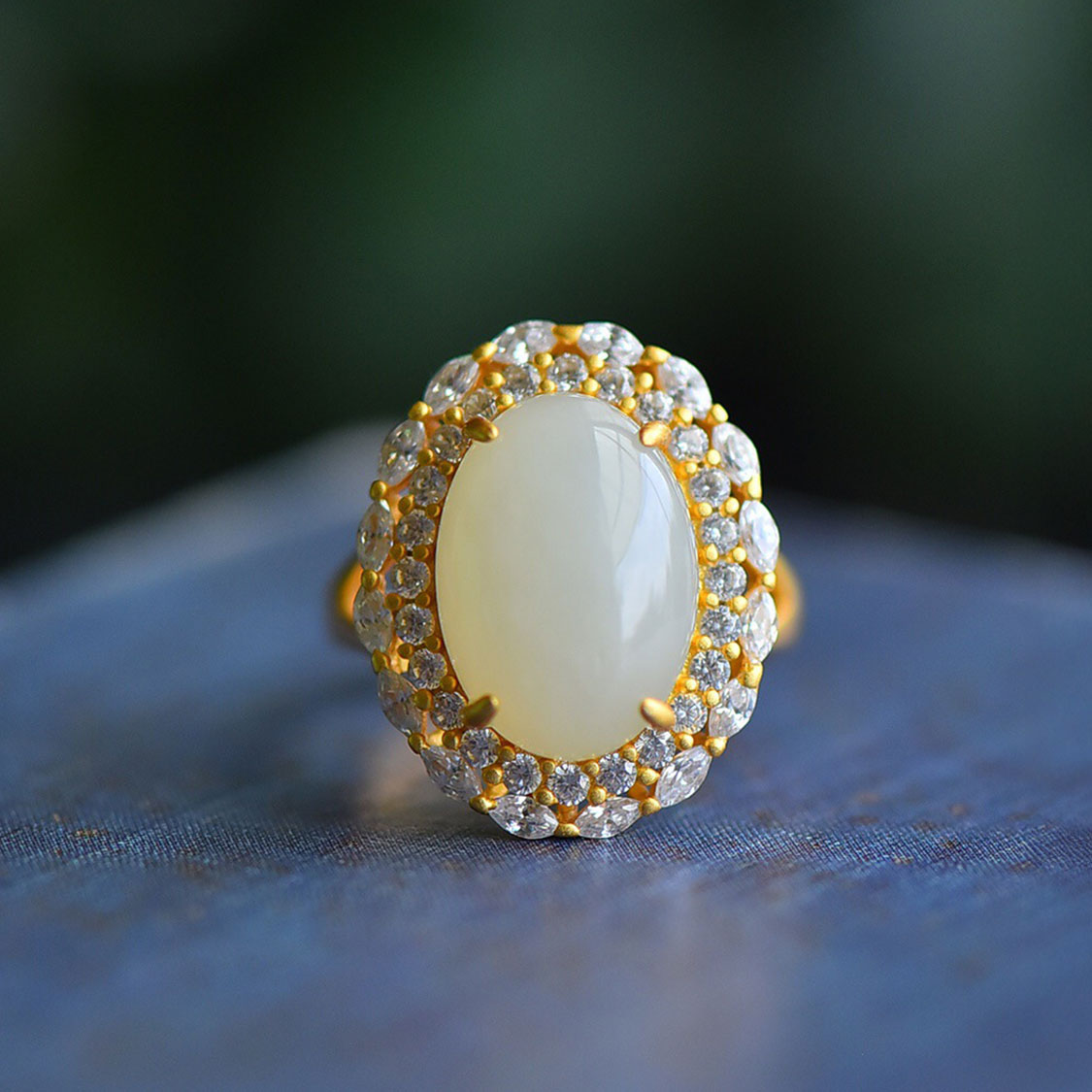 選用溫潤細膩的和田玉作為主石,切磨成飽滿橢圓 cabochon 造型,表面高拋光處理,如凝脂般柔亮,佩戴在指間自然映出柔和光澤,顯氣質也顯手白。 主石外圈密鑲多顆璀璨鋯石,排布成花瓣狀光環,無論抬手或握杯時都能折射細碎光芒,營造低調卻奢雅的高級感。 戒托使用 S925 純銀製作,提供電鍍金色與電鍍銀色兩個款式可選,戒圈為開口可調節設計,方便自行微調大小,適合不同手圍配戴,也很適合作為送禮款式。 隨附珠寶首飾鑑定證書,證書上標明「和田玉戒指」、總質量約 4.75g、金屬材質 S925,讓材質來源與品質一目了然,無論自留收藏或送給長輩、伴侶皆更安心。