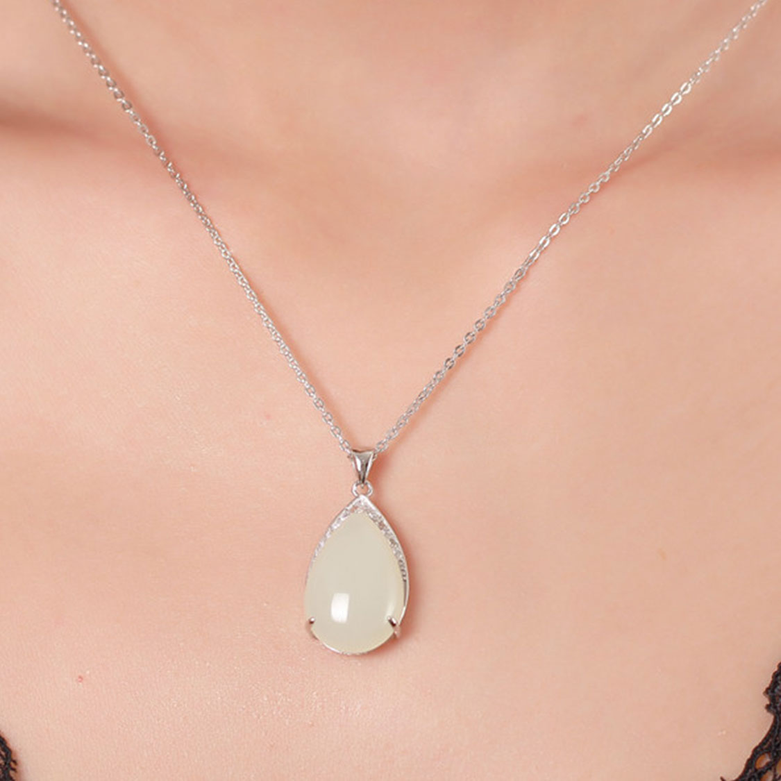嚴選天然和田白玉打磨成優雅水滴造型,整體輪廓修長飽滿,玉面拋光細膩,呈現柔和奶白光澤,在燈光下能看到內部細緻質感,低調卻非常顯氣質。