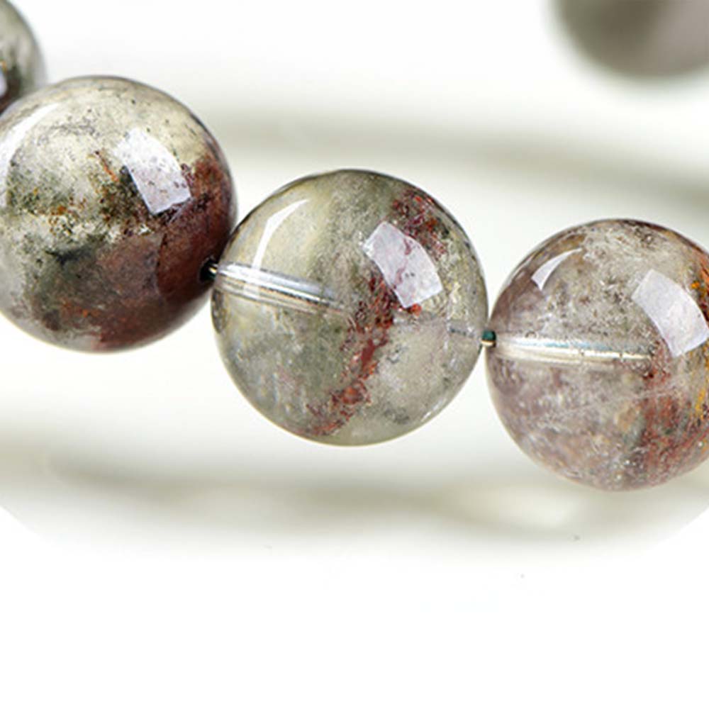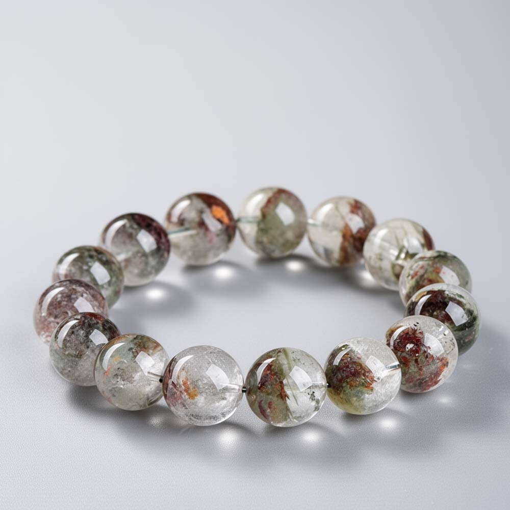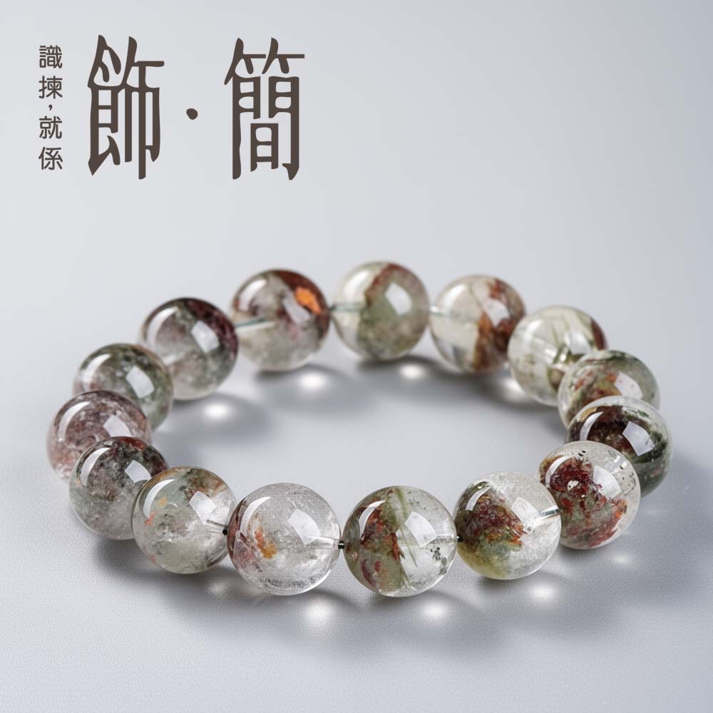 本款「莫奈幽靈聚寶盆圓珠手鏈」以天然透明石英為基礎,晶體內部夾帶多色礦物包裹體,形成層次豐富的異象紋理。這類帶有明顯內含景觀的石英,通常被歸類為幽靈水晶(Phantom Quartz)或庭園水晶(Garden Quartz)。在生長過程中,石英曾多次中止與再度生長,不同時期沉積的礦物如綠泥、赤鐵礦、氯化物、泥質等被封存其中,構成猶如山巒、雲霧或盆狀聚集的畫面。