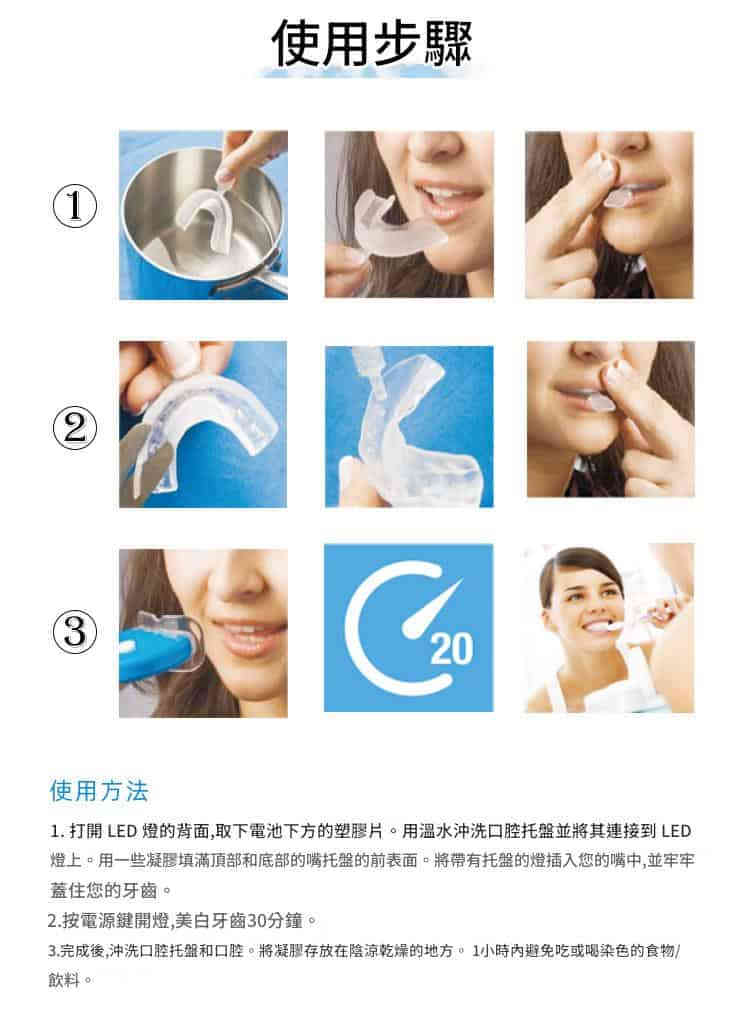 藍光照射:戴上牙托,開啟LED燈,靜待30分鐘。
