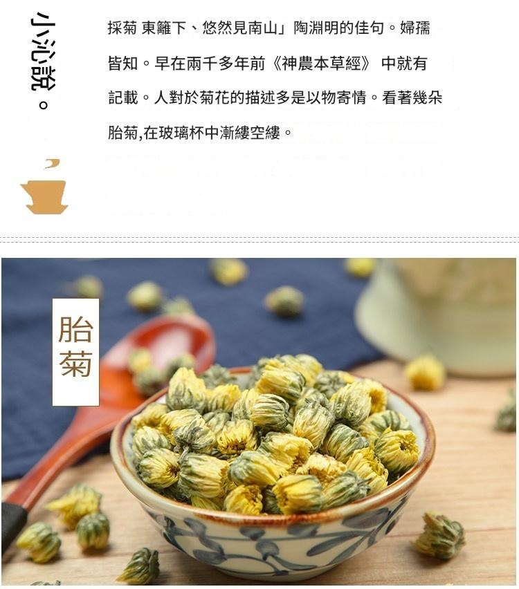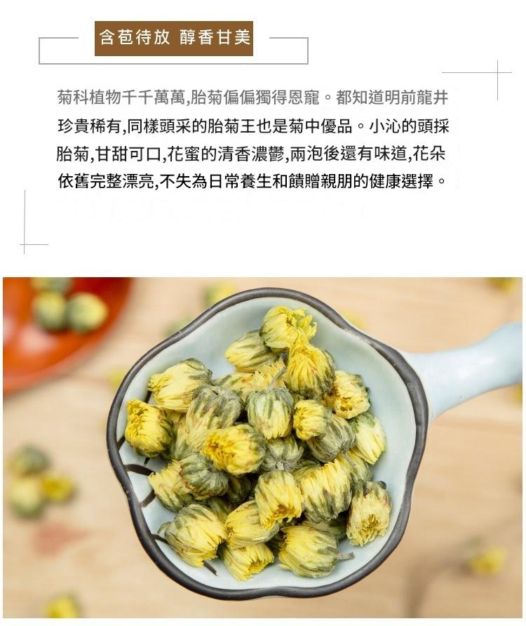 「採菊東籬下,悠然見南山」——陶淵明筆下的菊花,自古便是高雅與恬淡的象徵。胎菊,取自白菊未綻放之時,花朵內斂蜷曲,色澤金黃如蜜,香氣清甜馥郁,是菊花中的極品。