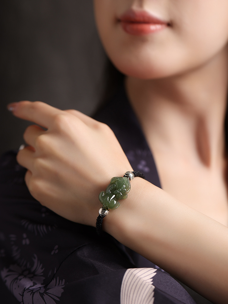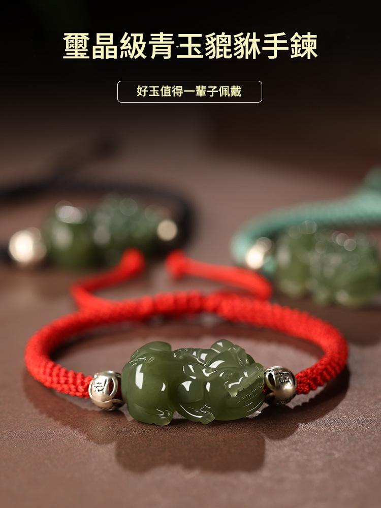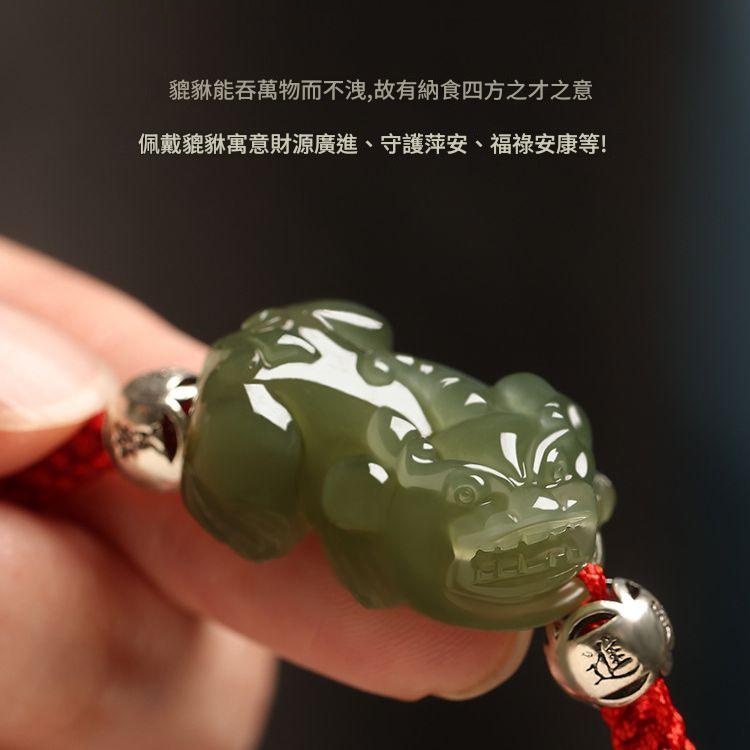 這款新疆和田玉招財情侶小貔貅青玉手鏈,將迷你貔貅與傳統紅繩編織工藝相結合,專為情侶設計,既時尚簡約又承載著招財納福的美好寓意。以下是其詳細的產品特點介紹: