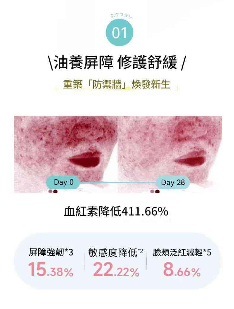 強韌屏障,舒緩敏感:高純度角鯊烷,直擊肌膚乾癢不適,模擬天然皮脂,有效修護肌膚「防禦牆」,顯著降低泛紅與敏感度。
