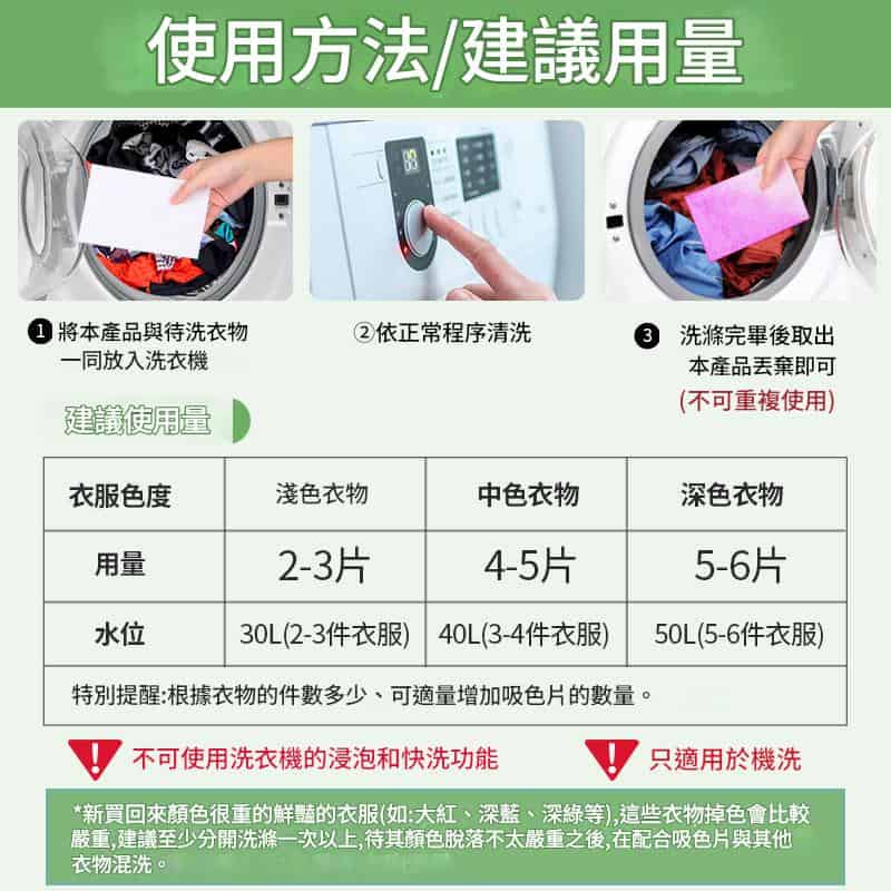 將吸色片與待洗衣物一同放入洗衣機。