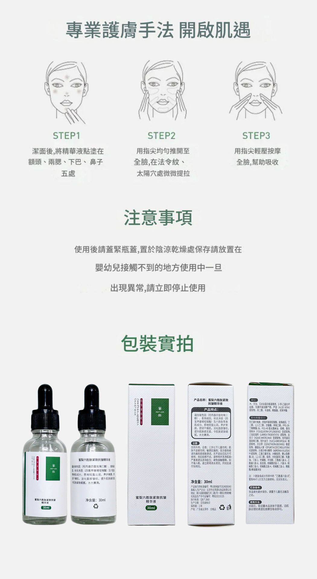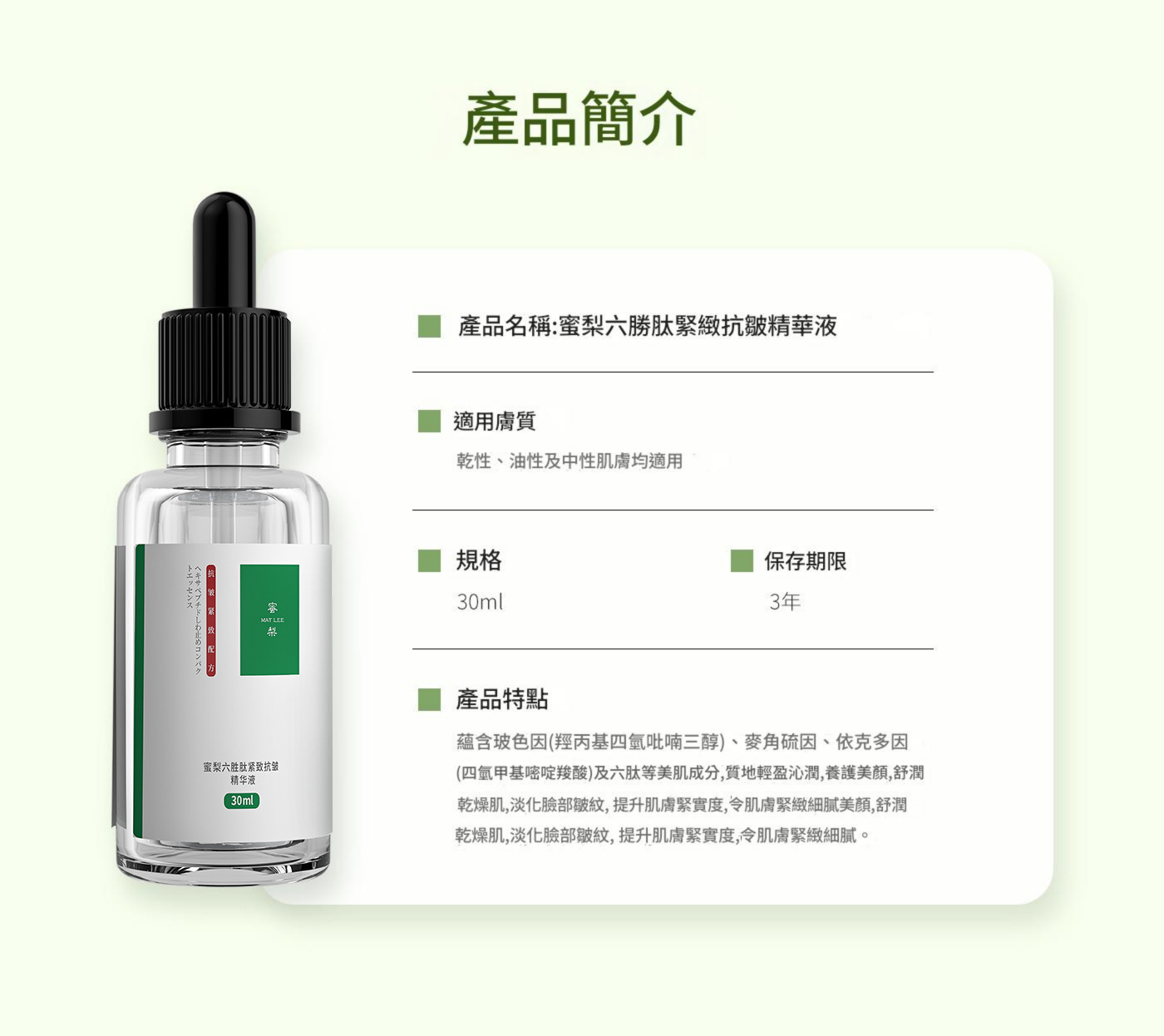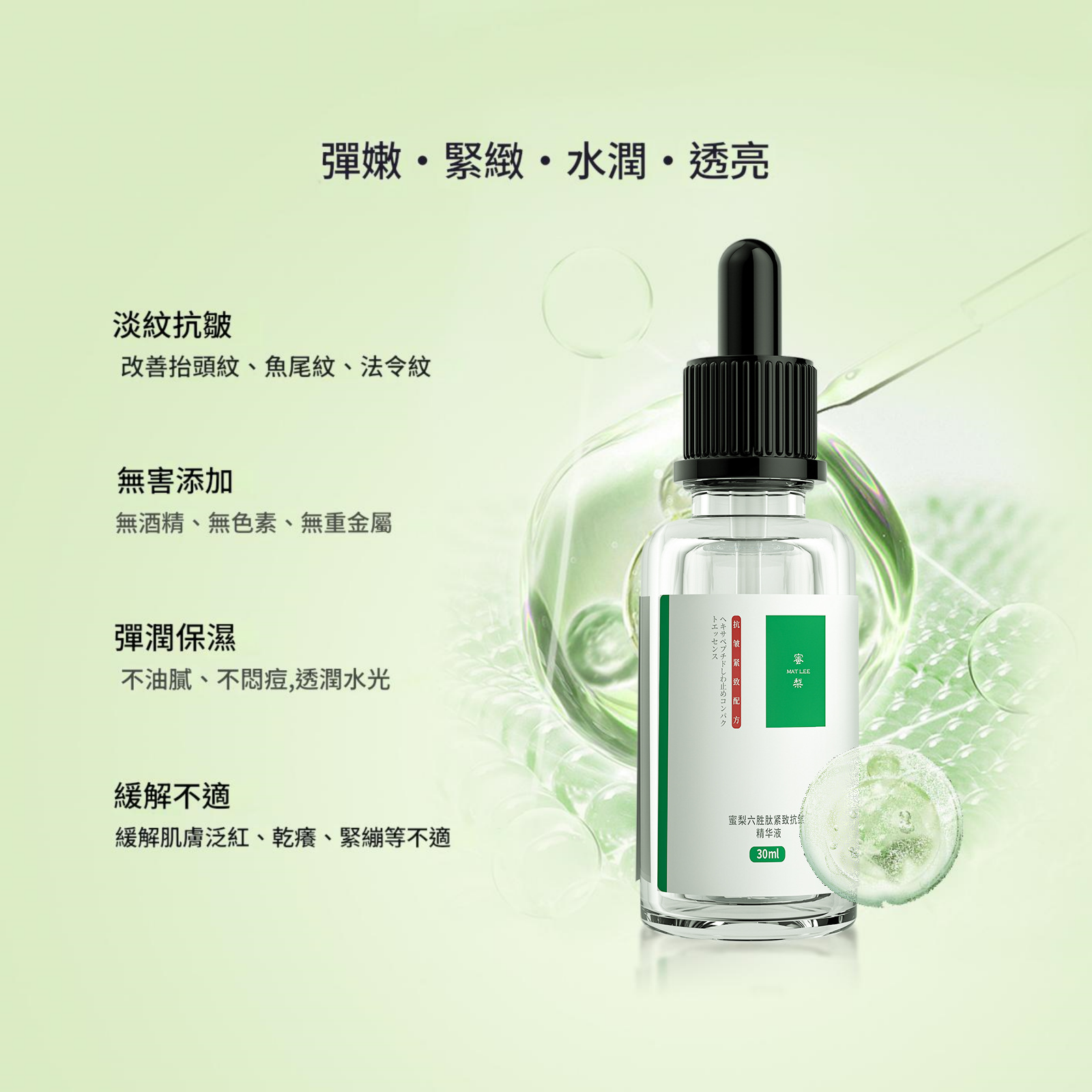 蜜梨六勝肽緊緻抗皺精華液,蘊含高濃度「六勝肽」配方,搭配玻色因、麥角硫因、依克多因等多重卓效抗氧成分,深入肌底修護,針對抬頭紋、魚尾紋、法令紋等歲月痕跡,有效淡化細紋、提拉輪廓,重拾肌膚緊緻彈潤。