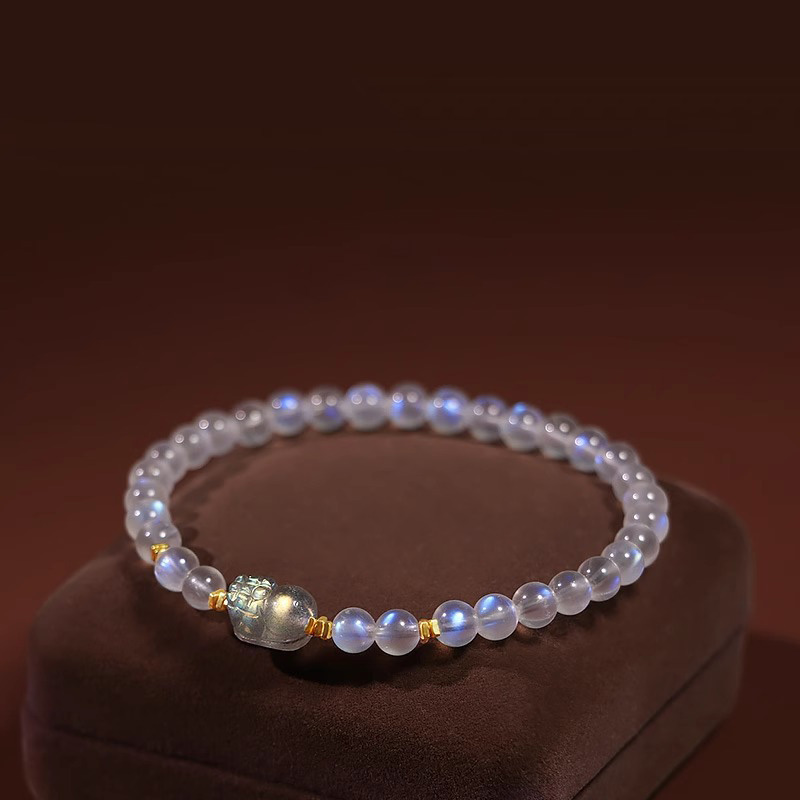 月光如水,瑩潤靈動: 月光石圓珠經精細打磨,呈現光滑圓潤的質感,顆顆泛著如水般的藍光,色澤瑩潤通透,如果凍般可愛靈動,賦予手鏈獨特的奇幻魅力。