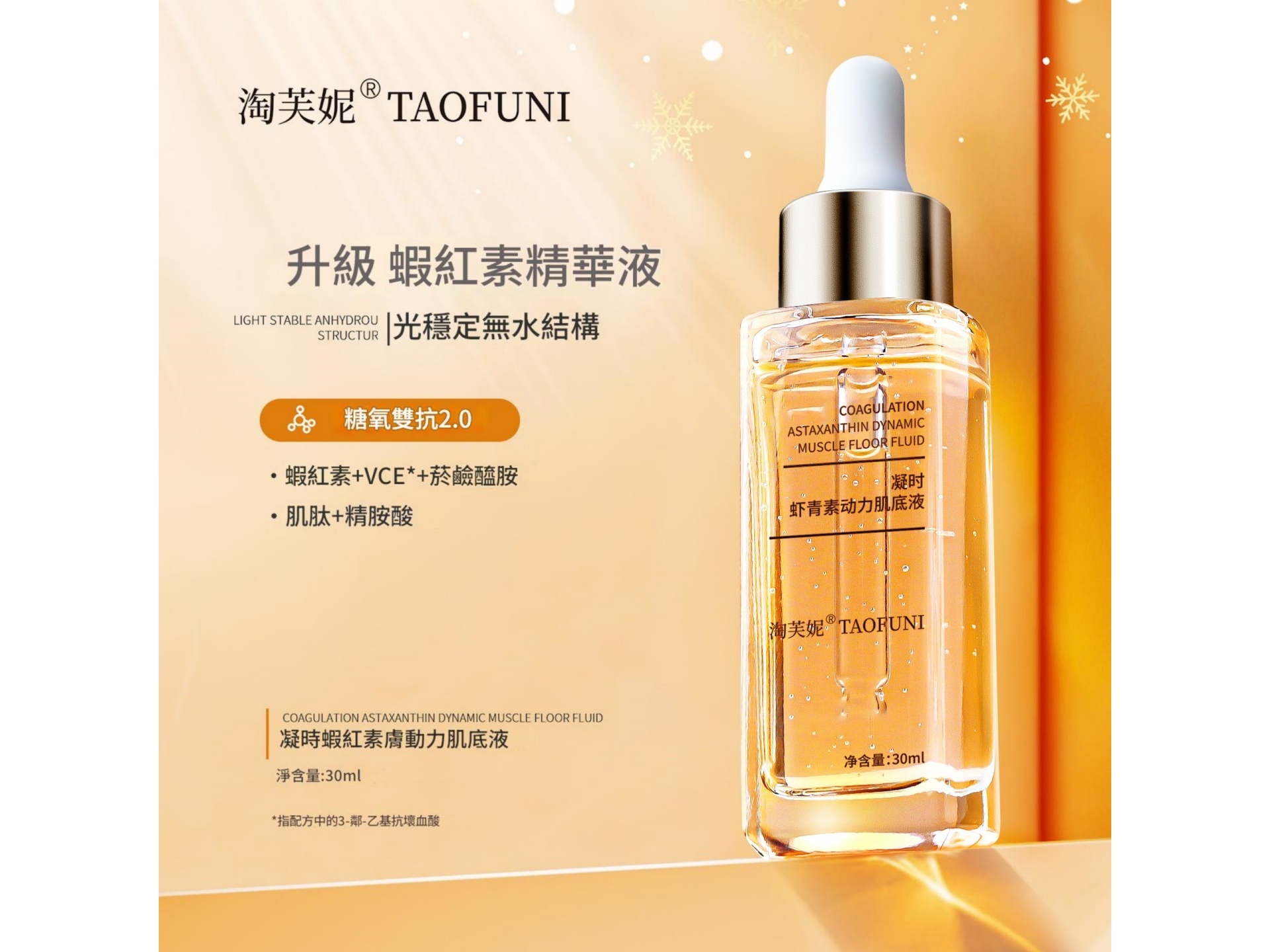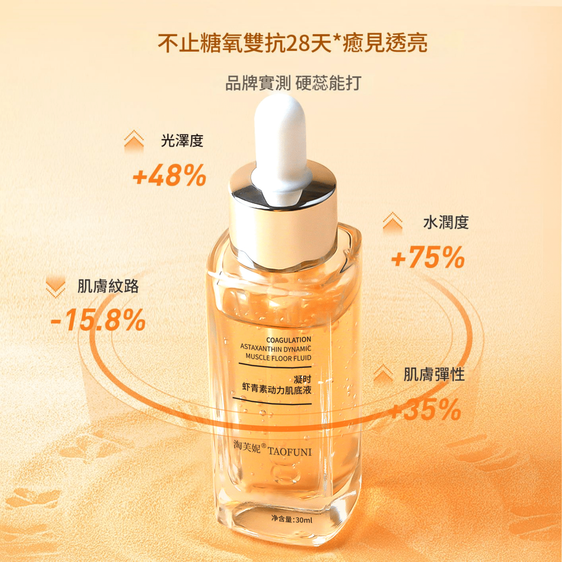 淘美妮凝時蝦紅素動力肌底液,採用「光穩定無水結構」,結合蝦紅素、VCE、菸鹼醯胺、肌肽與精胺酸,一瓶實現抗氧、抗糖、提亮、修護,喚醒肌膚年輕記憶。