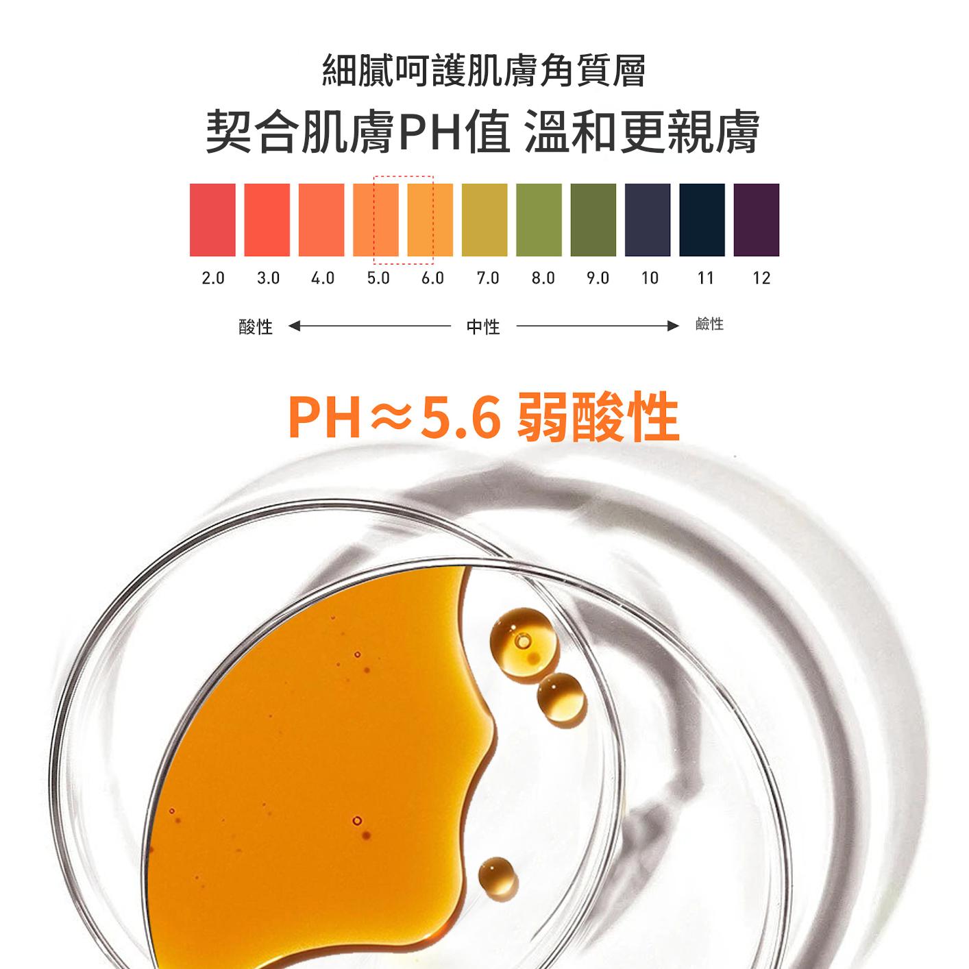 pH值約5.6,貼近肌膚天然酸鹼值,溫和滲透,不破壞角質層,敏感肌也適用。