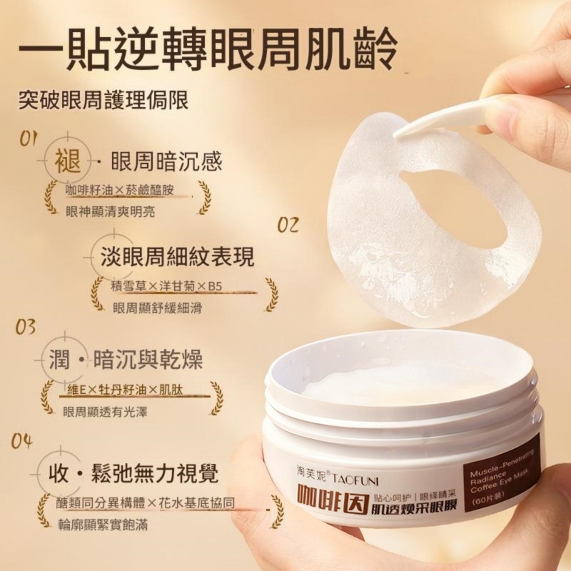 淘芙妮咖啡因肌透煥深眼膜,以「脂質動能載體 × 菸鹼醯胺通路」為核心,結合仿生鎖水矩陣與亮感煥醒複合體系,一片改善多重眼周問題,重現明亮緊緻雙眼。