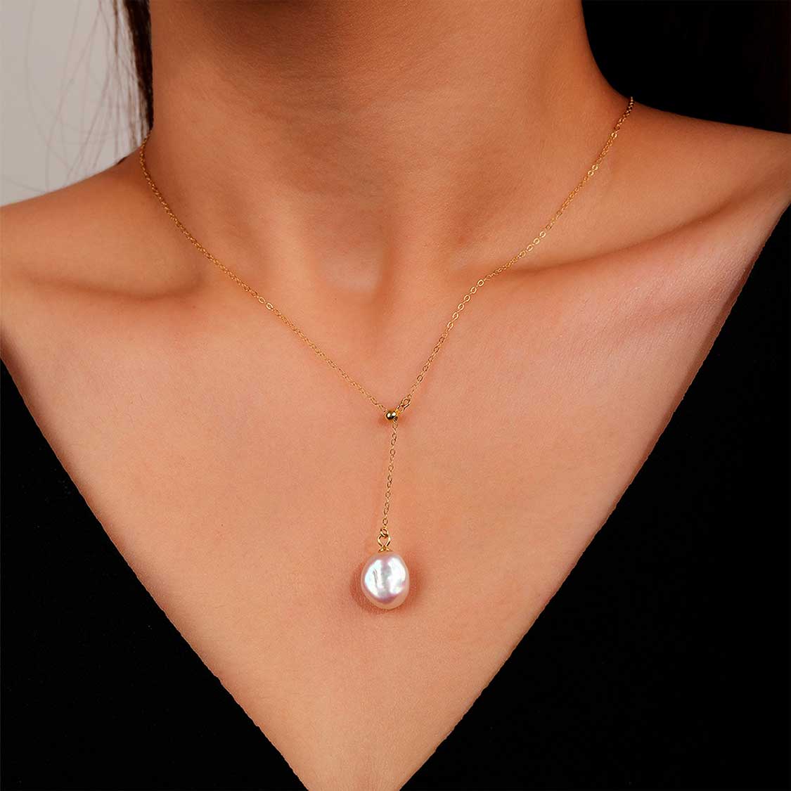項鏈總長約 45-50 公分(可根據客戶需求調整),Y字開口寬度設計適配大多數成年女性的肩膀寬度,珍珠自然垂墜於胸部,呈現出靈動而優雅的視覺效果。