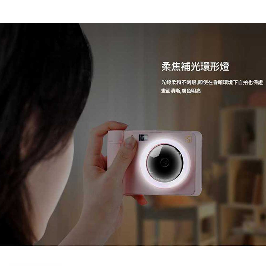 機身配備八檔無級濾鏡旋鈕,只需輕輕旋動即可切換多種風格效果,從文青色調到復古氛圍,所見即所得,讓每張照片都充滿個性。內建閃光燈與柔焦補光環形燈,在昏暗環境下自拍或合照也能保持畫面明亮、膚色細膩自然。