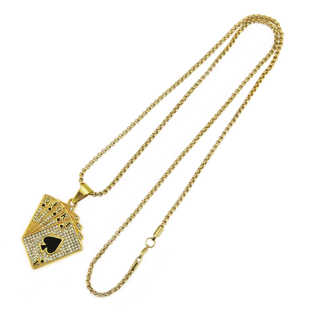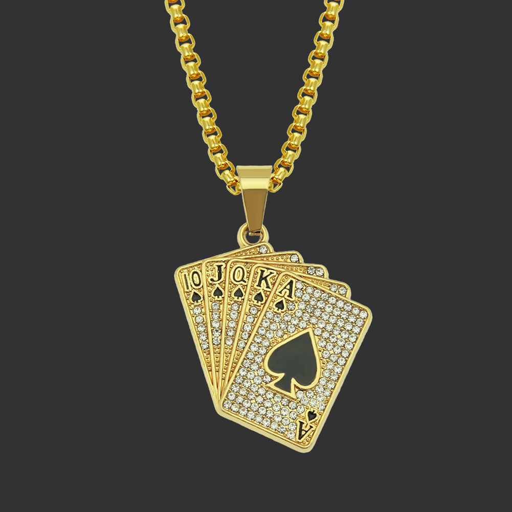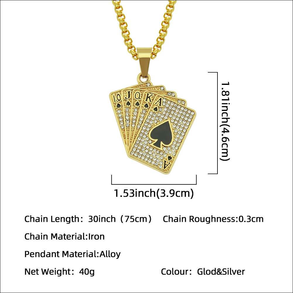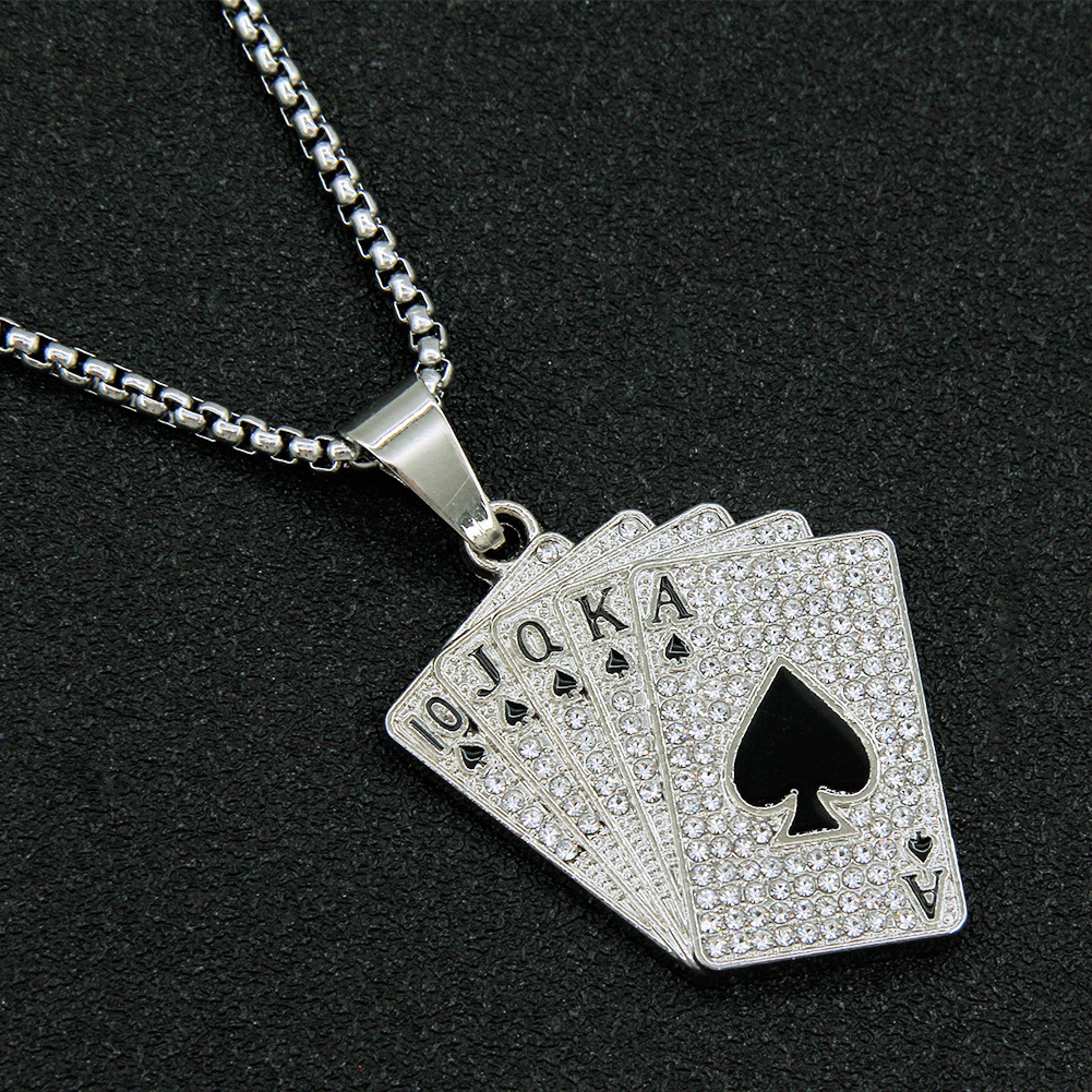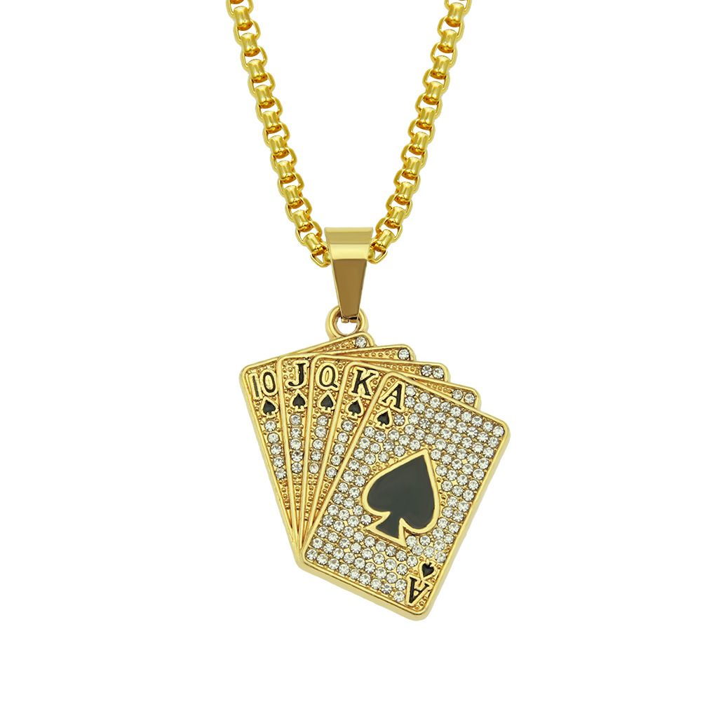 潮流鈦鋼男仕飾物 鑲鑽水晶同花順撲克牌吊墜頸錬