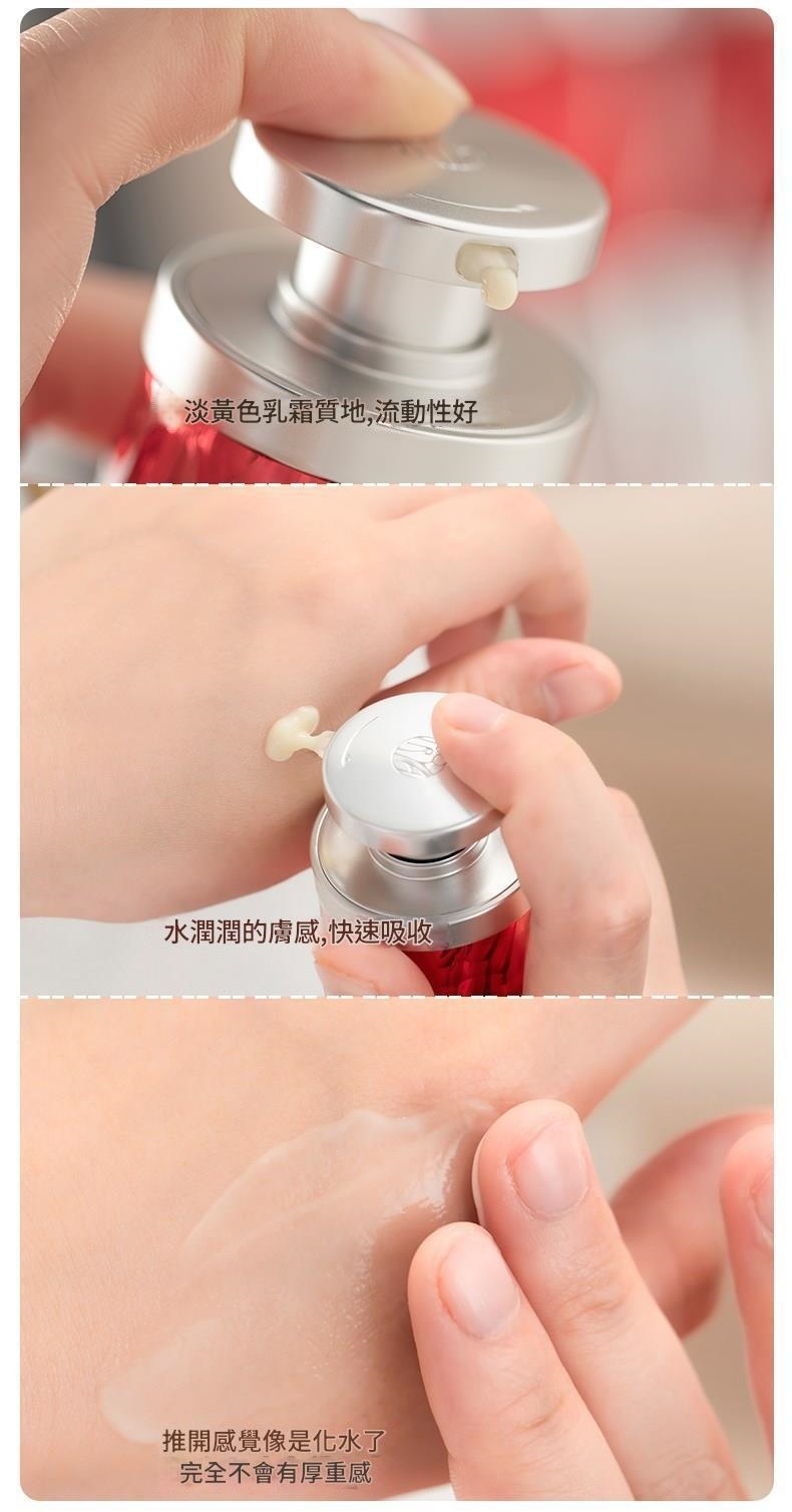 淡黃色乳霜質地,流動性好,水潤潤的膚感快速吸收,推開感覺像是化水,完全不會有厚重感。