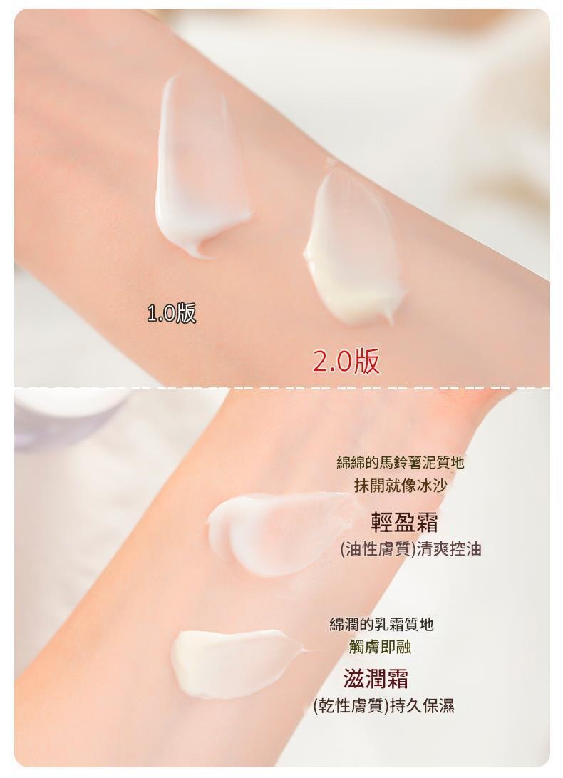 輕盈霜適合油性膚質,柔焦控油因子搭配羽感呼吸微粒,質地如綿綿馬鈴薯泥,抹開就像冰沙,清爽控油