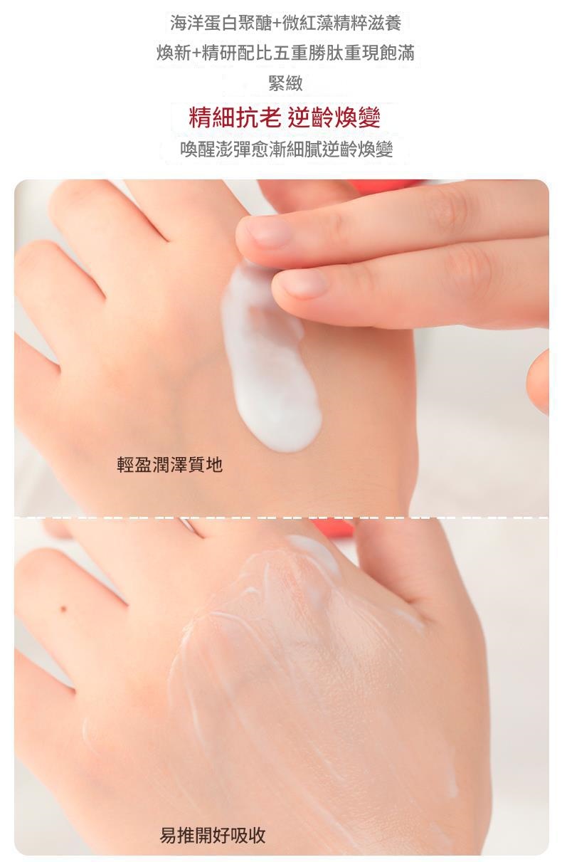注入海洋蛋白聚體與微紅藻精粹,平粗糙、細膩毛孔,提取自珍稀純淨魚類,純淨無污染。海洋蛋白聚體搭配微紅藻精粹,滋養煥新,重現澎彈愈漸細膩的年輕肌膚。