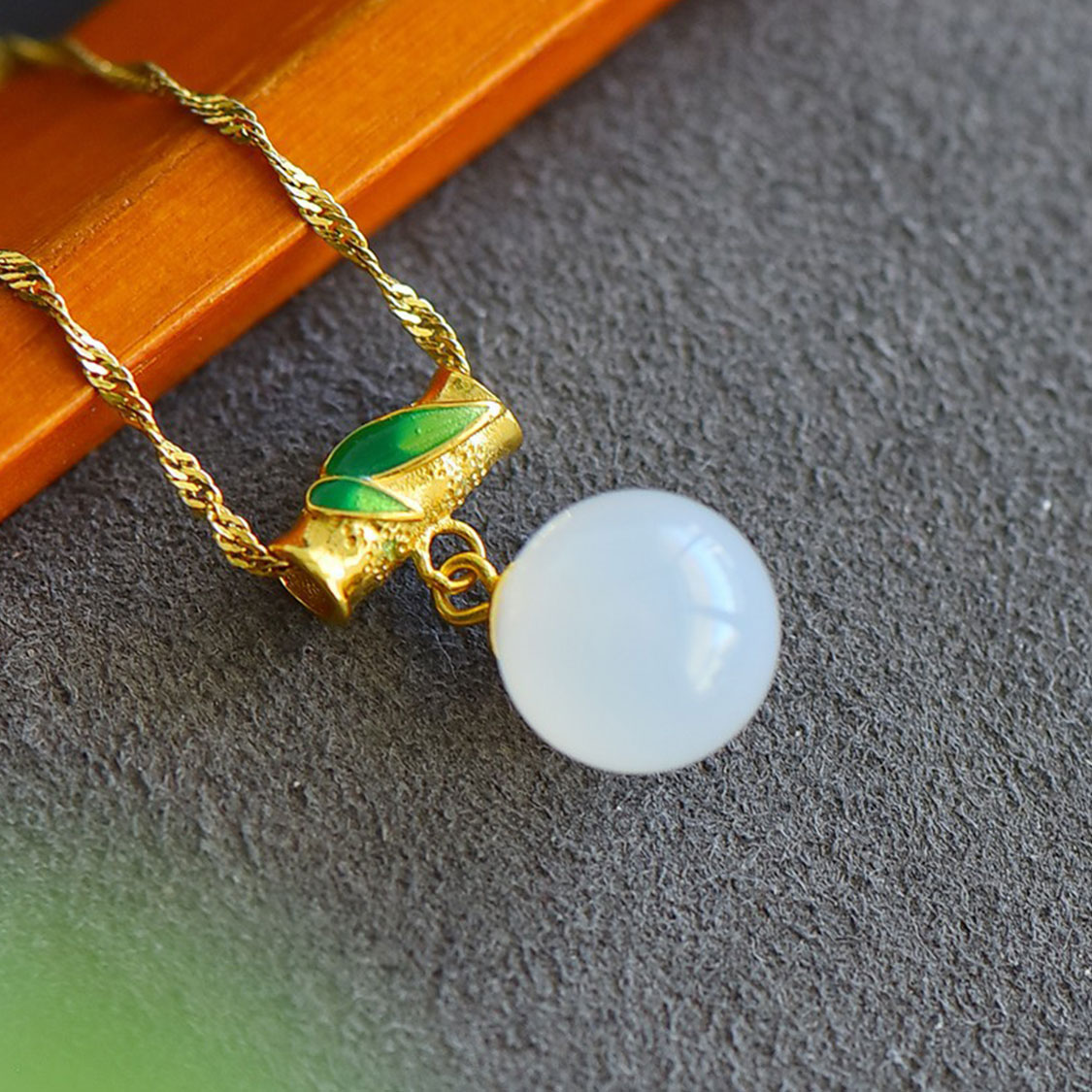以天然白色玉石打磨成圓潤珠形吊墜,玉色潔白帶柔和通透感,表面高拋光如小月亮般晶瑩可愛,佩戴在鎖骨間,走動間微微晃動,低調卻十分吸睛。