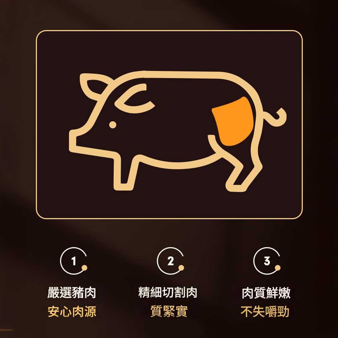 • 100%純豬肉,精選豬後腿肉,肉質鮮嫩耐嚼