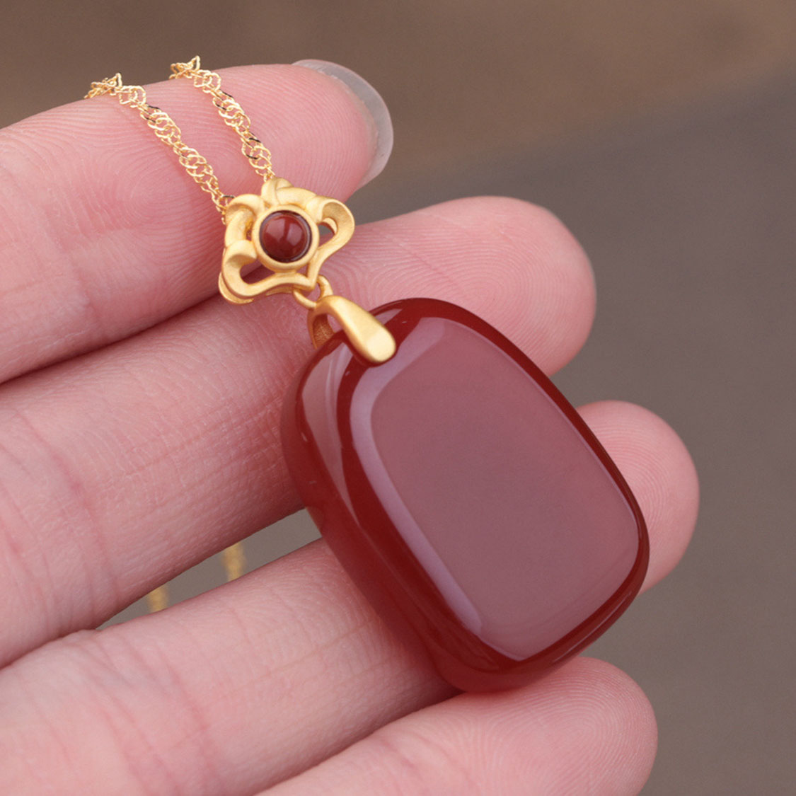 嚴選色澤飽滿的天然鴿紅色瑪瑙,打磨成圓角長方平安牌造型,線條圓滑流暢,表面高拋光處理,映出柔亮光澤,貼膚佩戴不刮手,日常行走間自然散發沉穩紅潤的玉石光感。