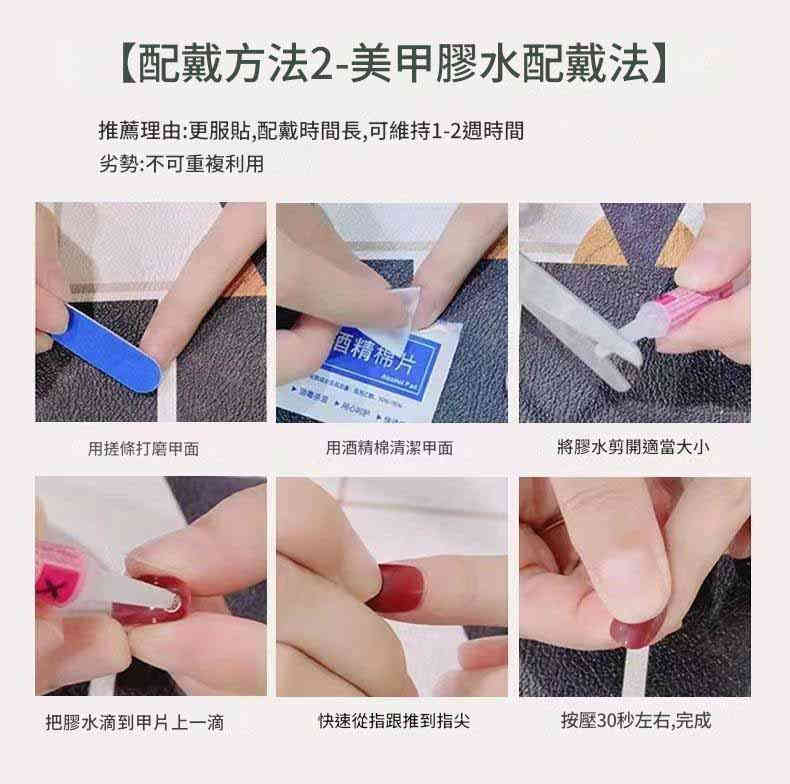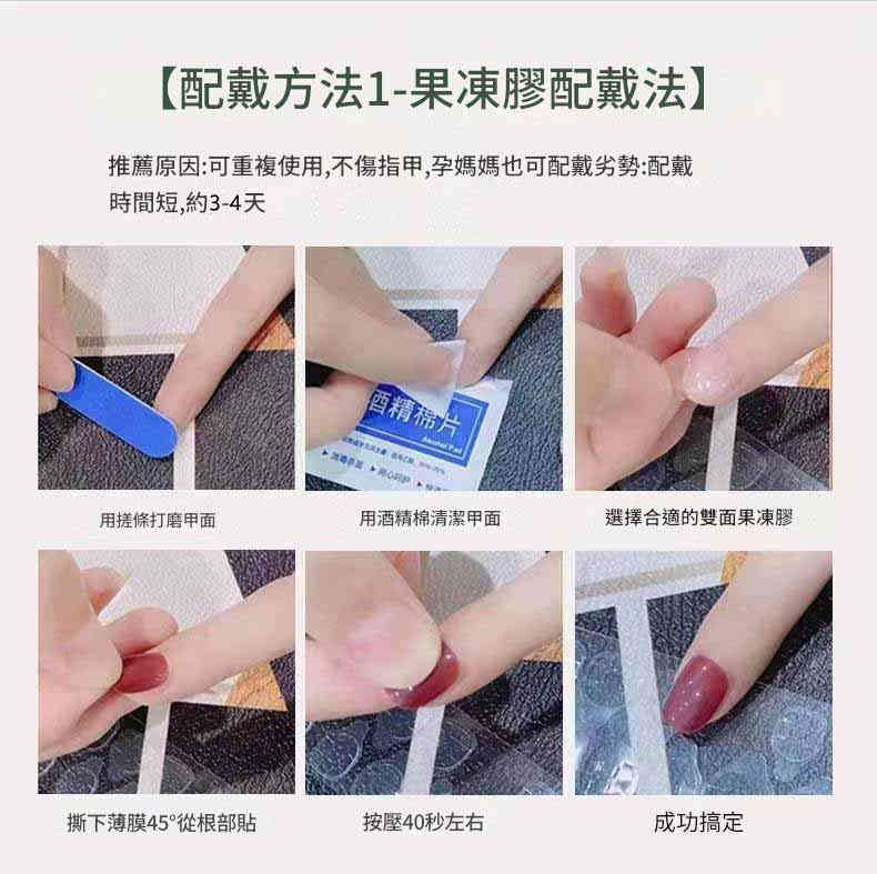 您可以在需要時(如週末、特殊場合)佩戴,平時則讓自己的指甲處於自然狀態,有足夠的時間恢復和生長,不會像做光療一樣需要持續補擦,讓指甲沒有休息的機會。可重複使用,減少浪費: