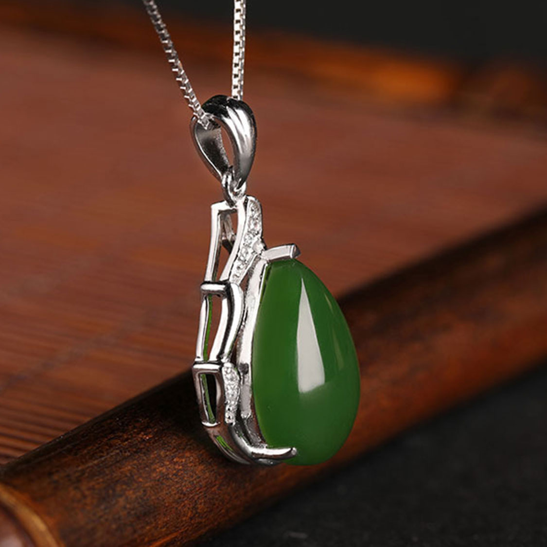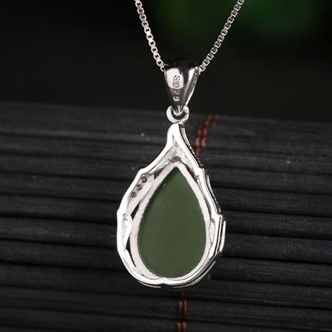 嚴選天然和田玉(碧玉)為主石,切磨成圓潤水滴形cabochon,玉色濃綠油潤,表面高拋光處理,在燈光下呈現柔和光澤,如一滴綠玉凝於鎖骨間,氣質優雅大方。