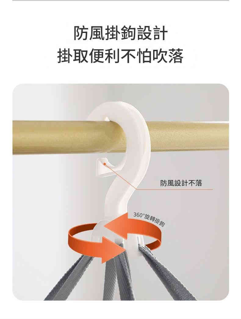 • 智慧掛鉤:360°旋轉防風掛鉤,掛取便捷不怕被風吹落