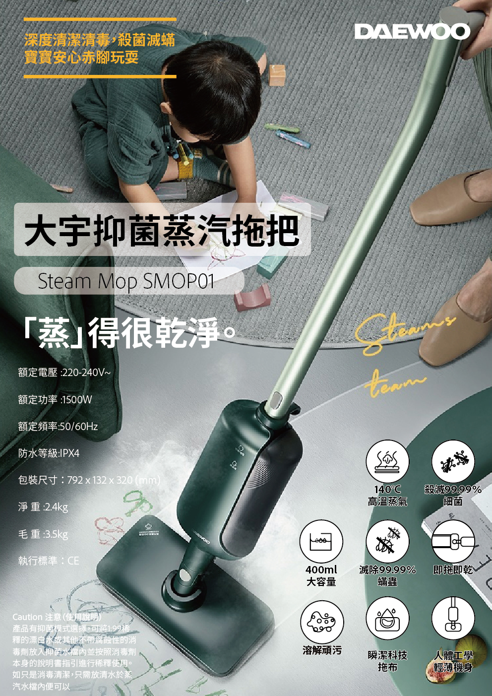 韓國 DAEWOO SMOP01蒸汽拖把 – 140°C 高溫蒸汽殺菌