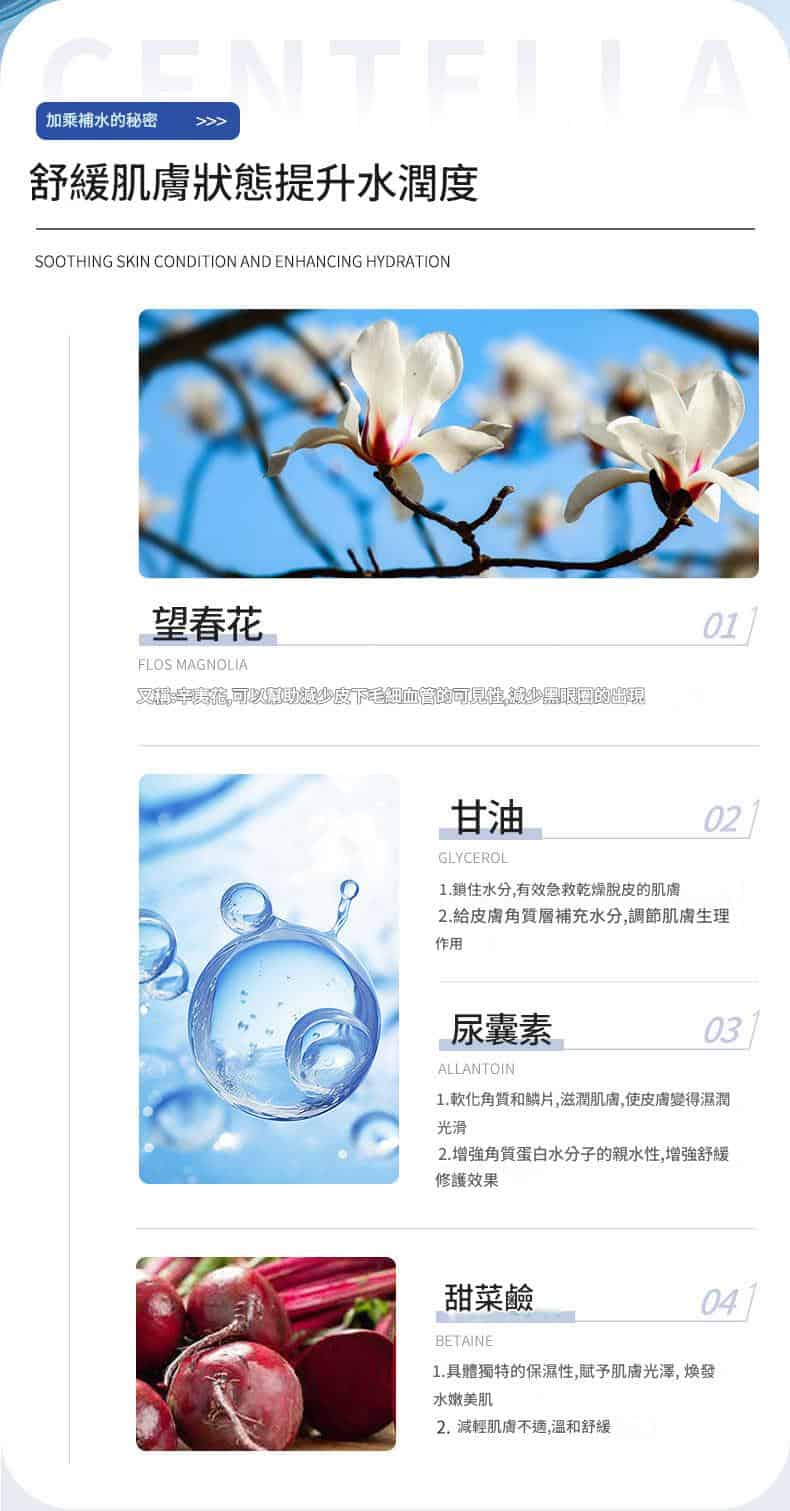 添加甘油、尿囊素、甜菜鹼,瞬間滲透補水,軟化角質、調節水油平衡,拯救乾燥緊繃肌,長效維持水潤光澤!