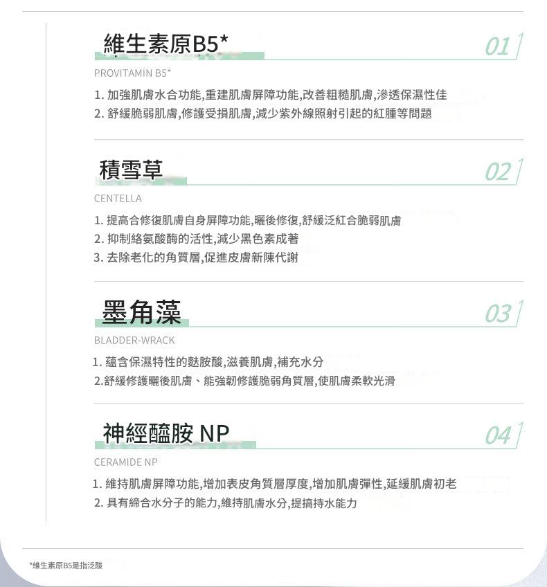 高濃度泛醇深入補水,強化肌膚屏障;搭配積雪草舒緩泛紅、修護脆弱肌,抵禦外界刺激,還原健康膚質!