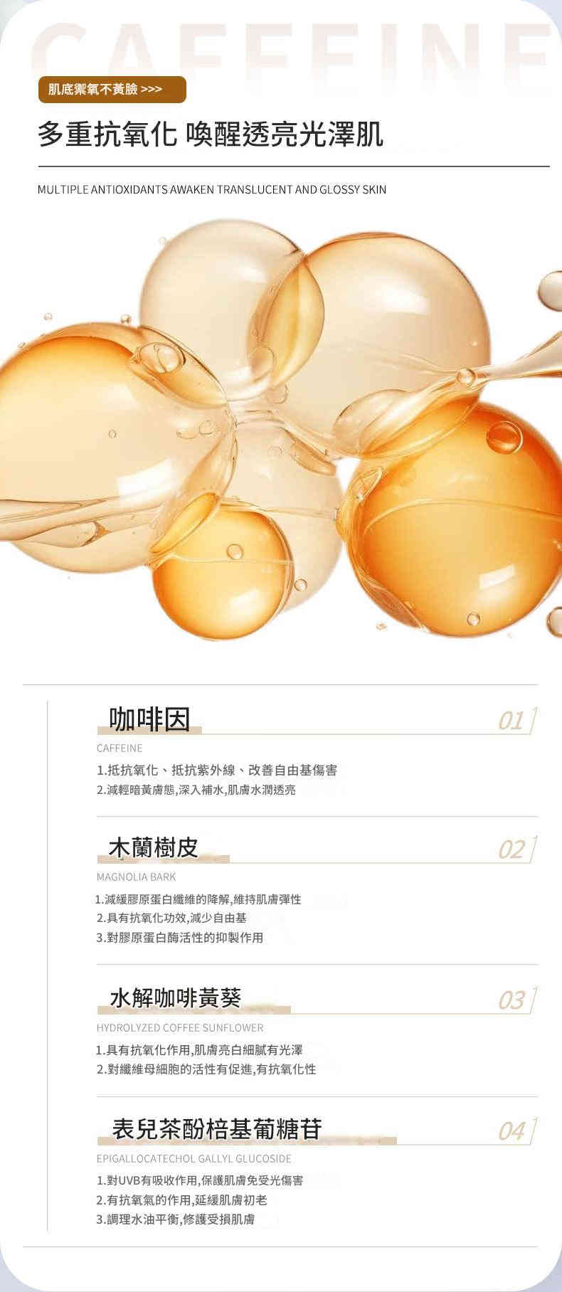 • 4重抗氧煥亮:咖啡因 + 木蘭樹皮 + 水解咖啡黃葵 + 表兒茶酚格基葡糖苷,多重植萃協同作用,有效抵禦紫外線與自由基傷害,從肌底喚醒光澤。