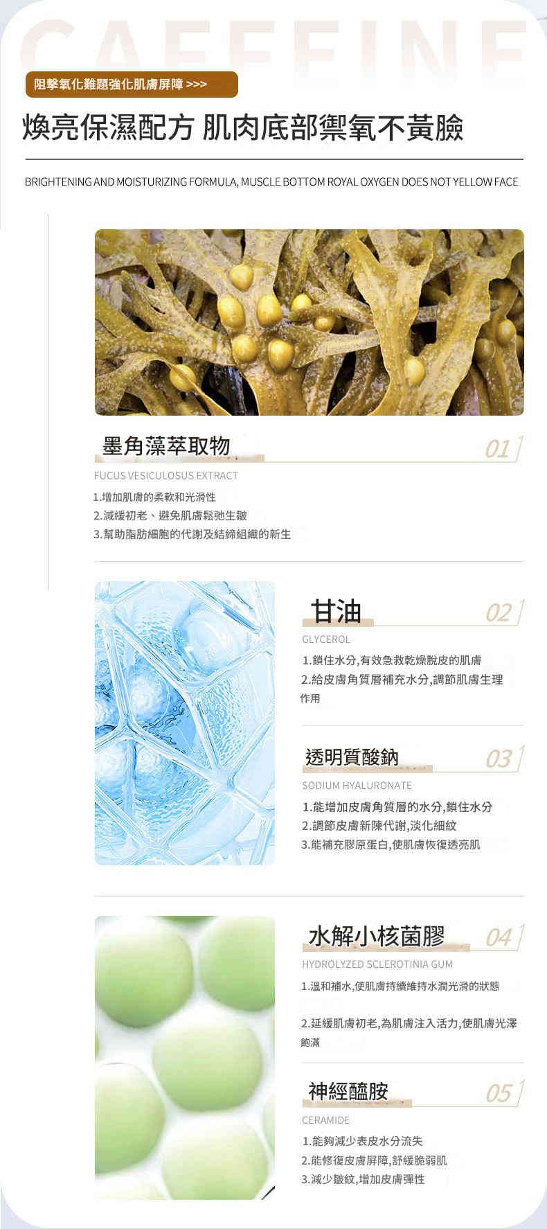 • 緊緻彈潤肌膚:墨角藻萃取促進膠原蛋白新生,幫助肌膚恢復彈性,對抗鬆弛與細紋。