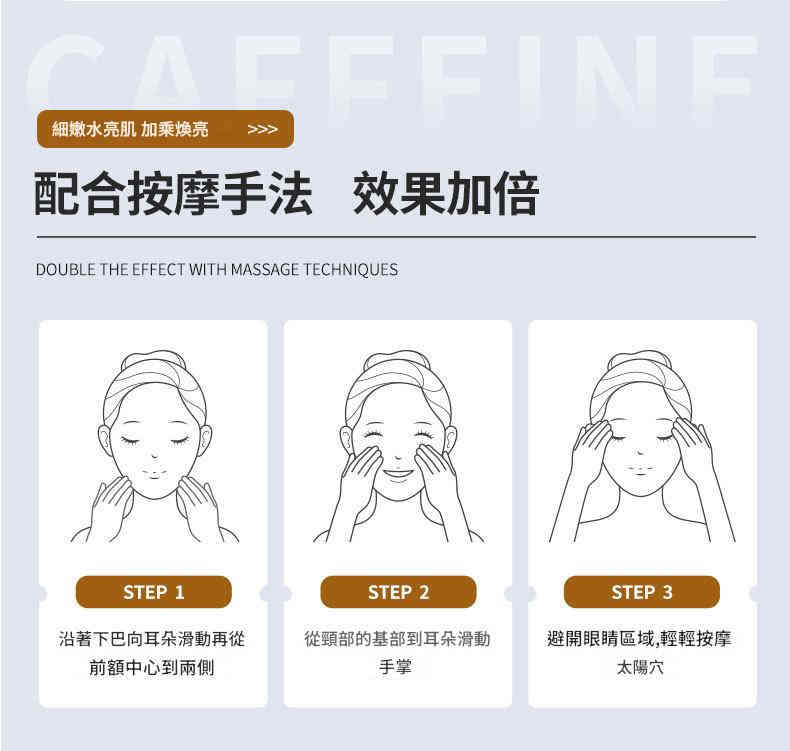 每日早晚於化妝水後,取適量精華液於掌心,輕輕按摩於臉部與頸部,可搭配提拉按摩手法效果更佳。