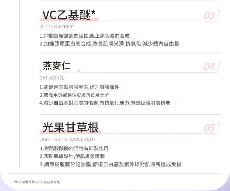 多重抗氧修護:添加VC乙基醚、木蘭樹皮、光果甘草根萃取,協同抗氧化,抵禦自由基傷害,預防肌膚鬆弛與初老。