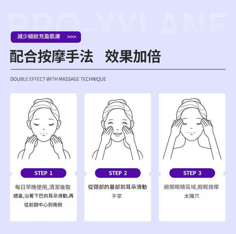 每日早晚於清潔後,取適量精華以按摩手法輕推全臉——