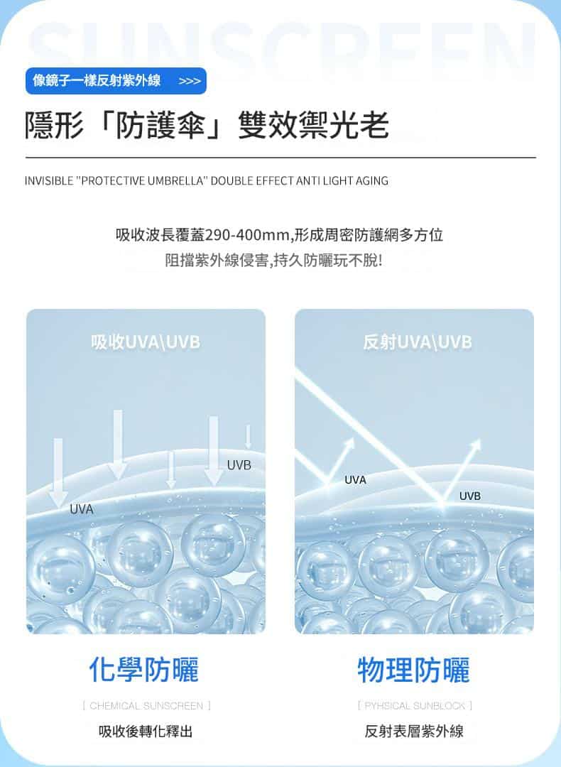 結合「物理+化學」5重防曬體系(二氧化鈦+奧克立林+阿伏苯宗等),阻隔UVA/UVB及可見光,長達12小時長效防護,360°對抗紫外線傷害!