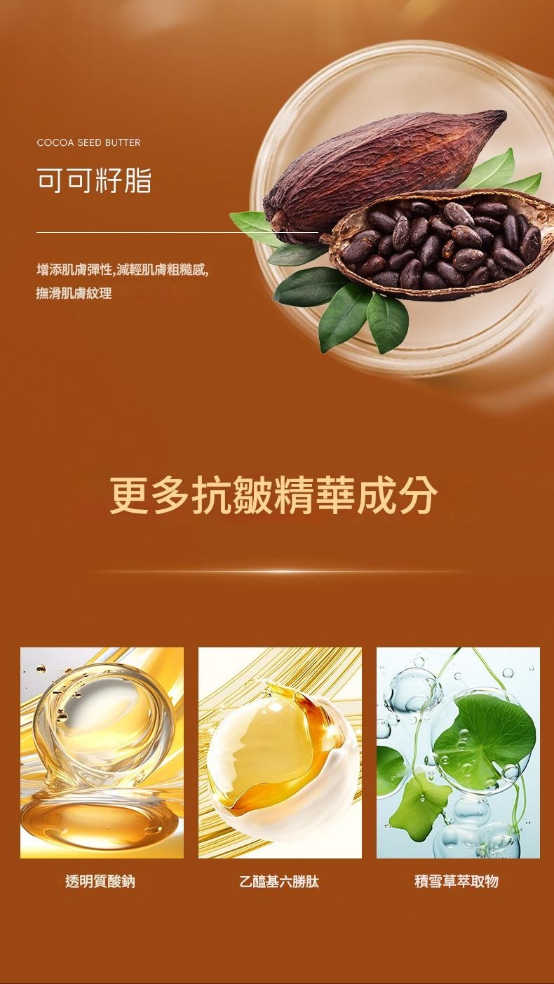 添加氫化椰子油、白池花籽油、可可籽脂、積雪草萃取、透明質酸鈉及乙醯基六胜肽等多重抗皺精華,從肌底補充水分、增強彈性,改善乾燥粗糙,淡化細紋,讓肌膚飽滿透亮。
