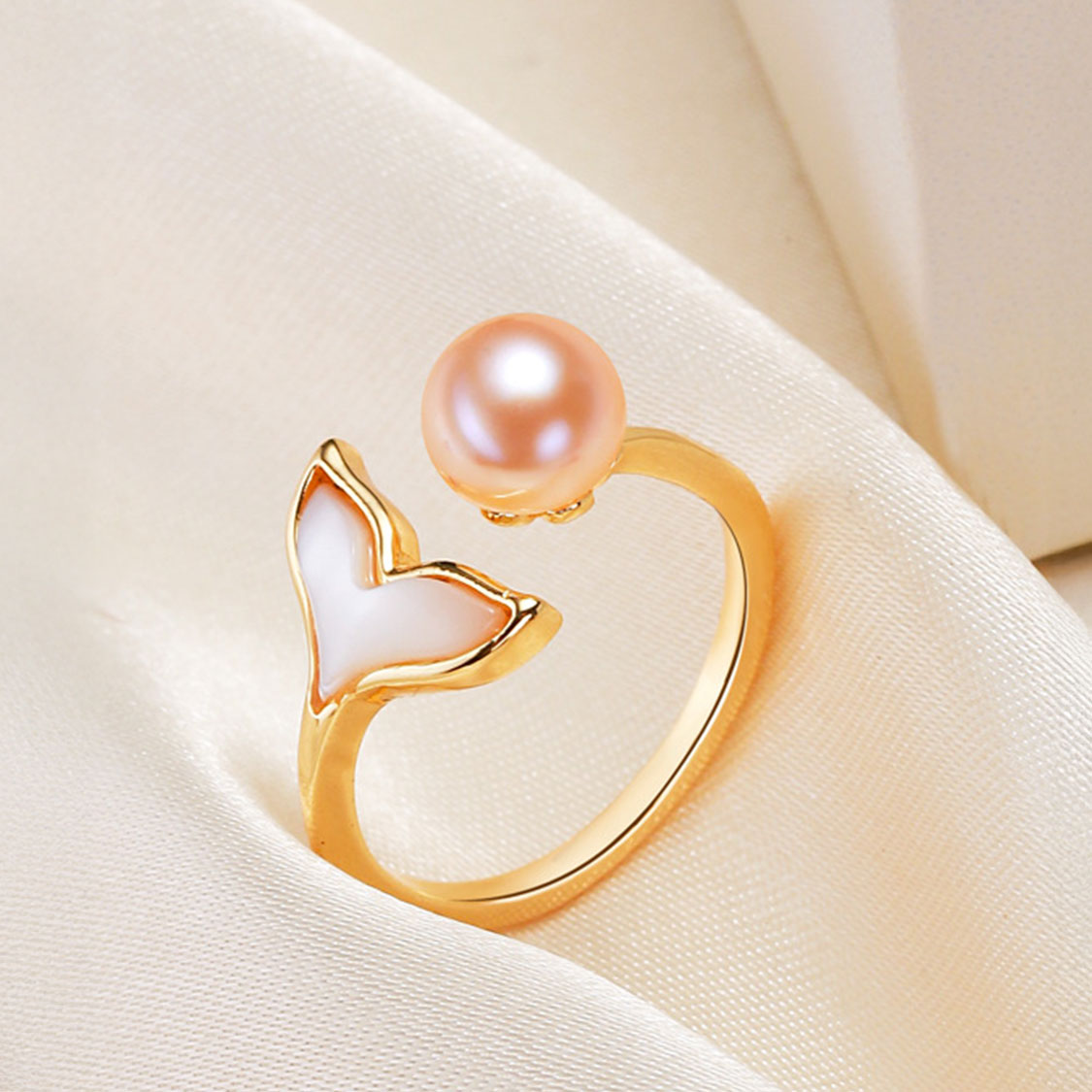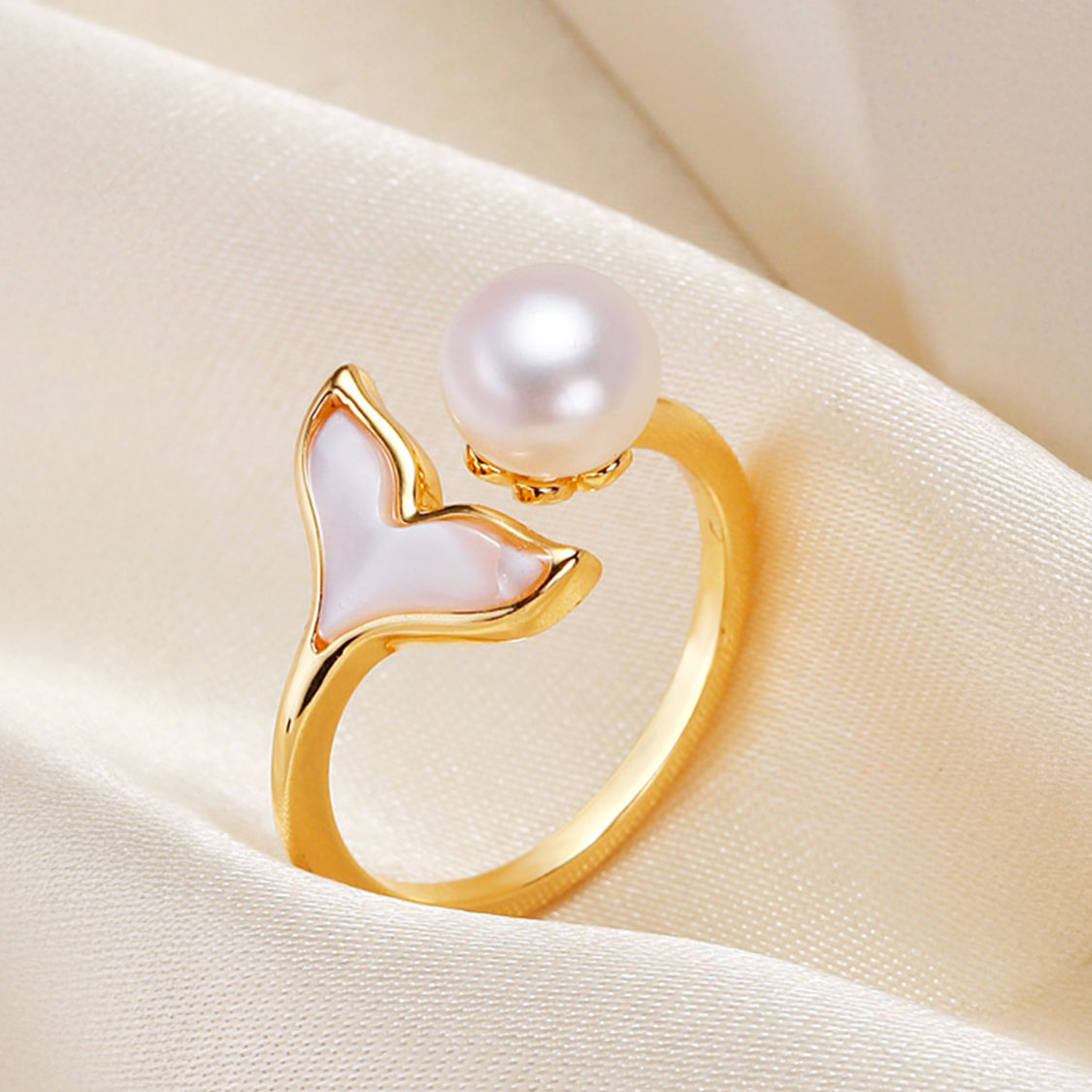 戒指採開口設計,可依照個人指圍輕鬆微調,無論戴在食指、中指或無名指都十分合適。細膩的鍍金光澤配上珍珠與魚尾元素,既有少女感,又不失成熟女人的柔和氣質。日常配牛仔與T恤能增添一點精緻感,搭配洋裝、小禮服或度假穿搭,更是拍照上鏡的小心機。