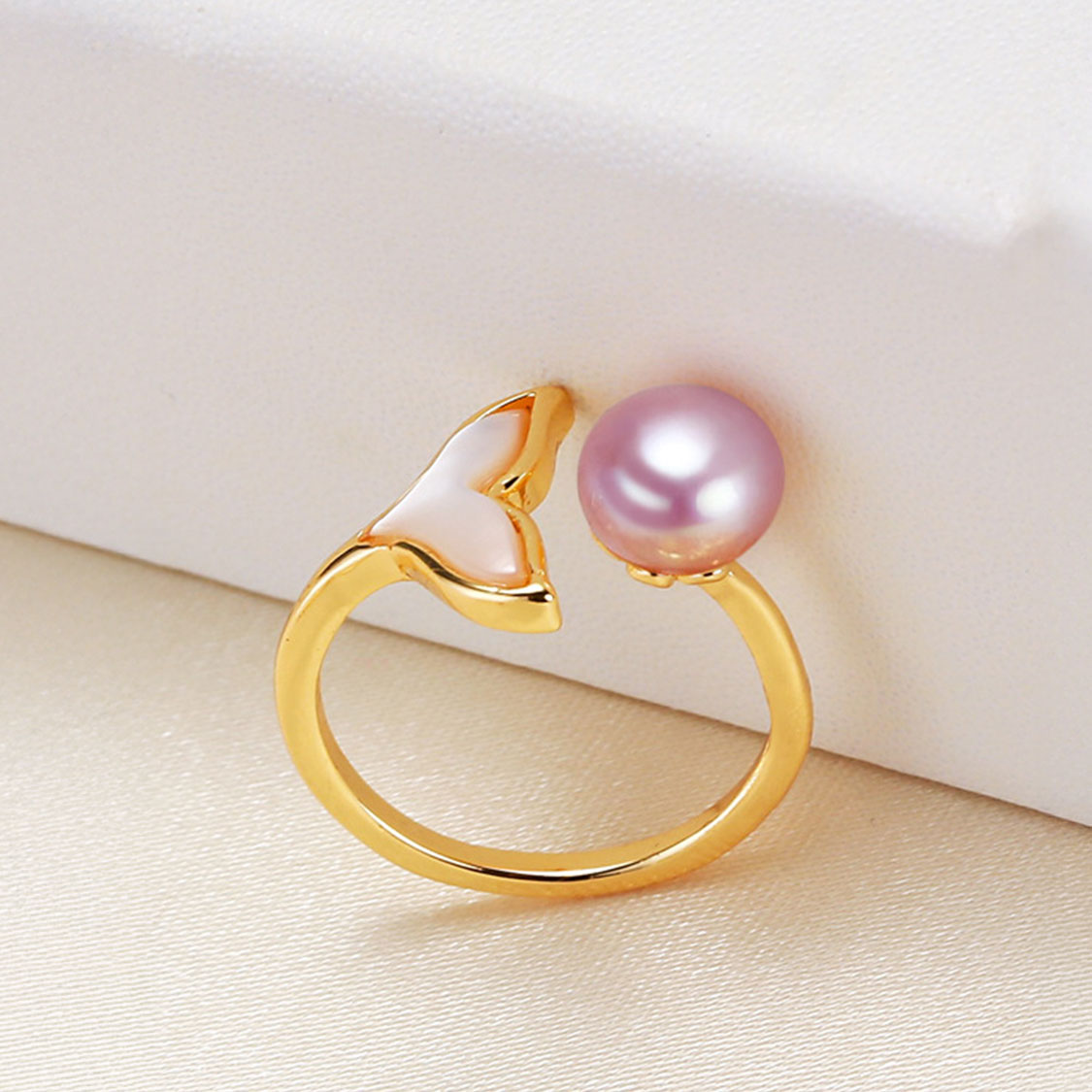 如果海邊的夕陽能戴在手上,大概就是這樣的感覺。魚尾淡水珍珠夢幻開口戒指,以細緻金色戒圈勾勒出柔美弧度,一端是靈動的白色魚尾造型,一端托起一顆約7mm天然淡水珍珠,珍珠光澤宛如海面上灑落的一點月光。白色珍珠清新優雅、粉色珍珠溫柔甜美、紫色珍珠神祕高級,三種色調把不同心情都收進指尖。
