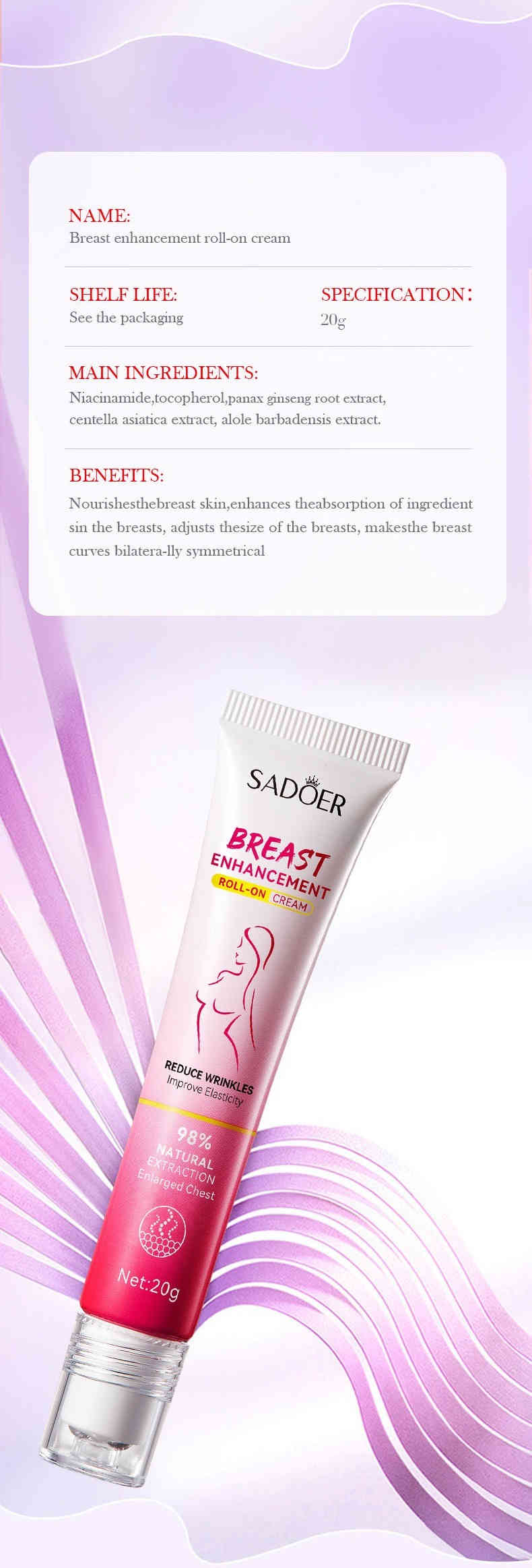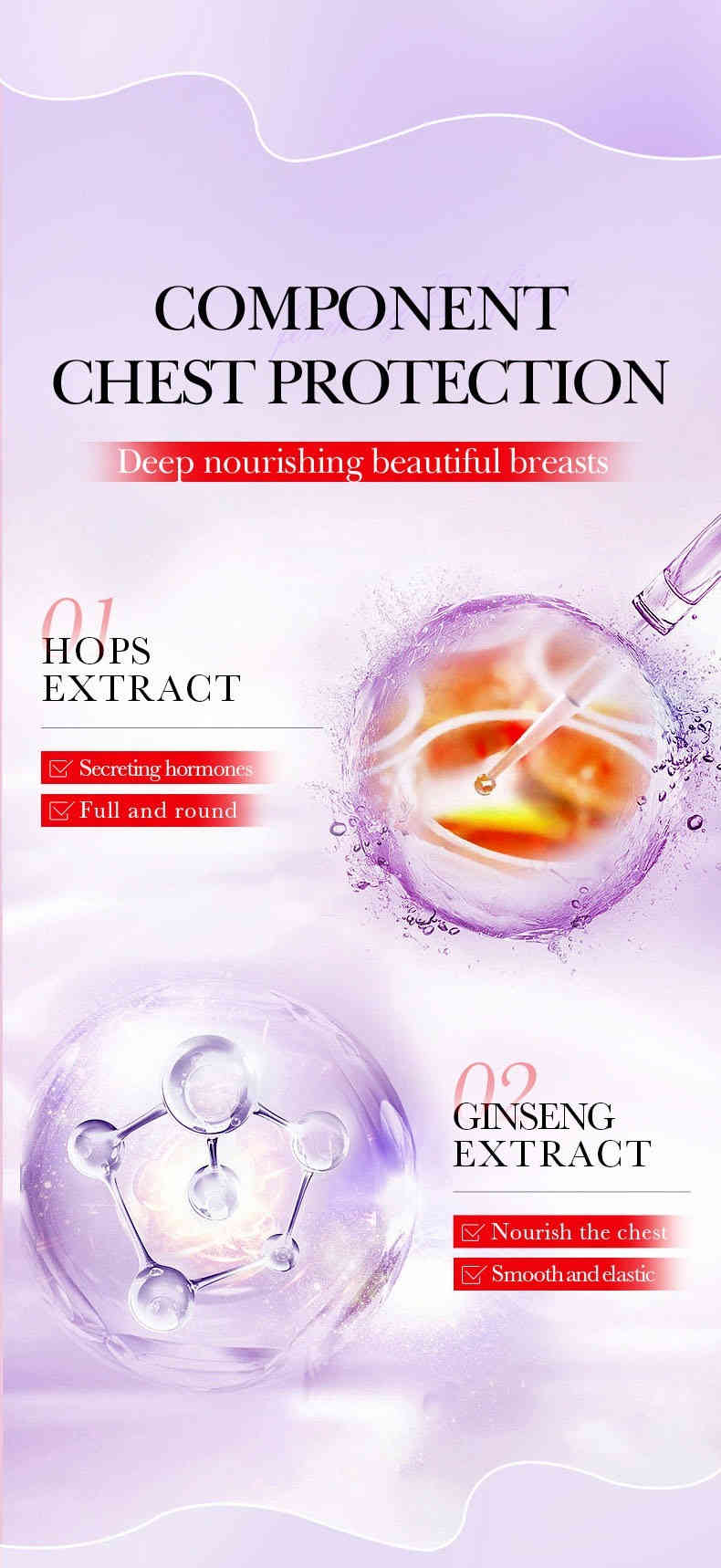 💎 98%天然萃取配方:蘊含菸醯胺、維他命E、人參根提取物、積雪草、蘆薈等滋養成分,溫和不刺激,深層滋養胸部肌膚。