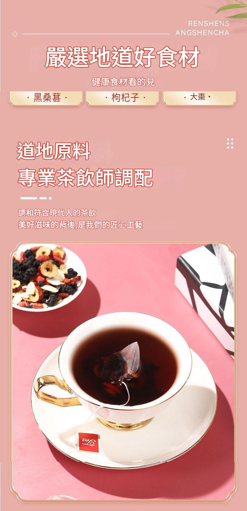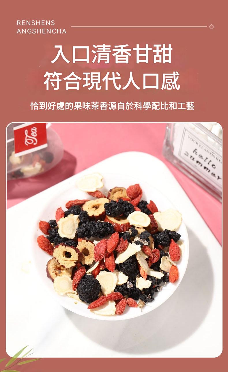 由專業茶飲師調配,融合人參的溫潤與桑葚的果香,入口清香甘甜,符合現代人飲用習慣,自然回甘不苦澀。