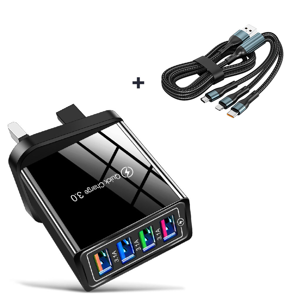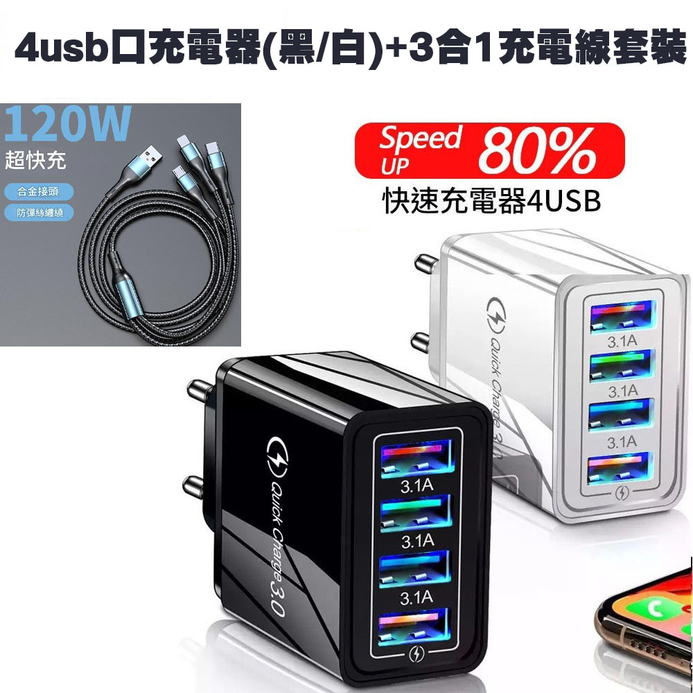 4USB口充電器(黑/白)+3合1充電線套裝|120W超快充|全能兼容
